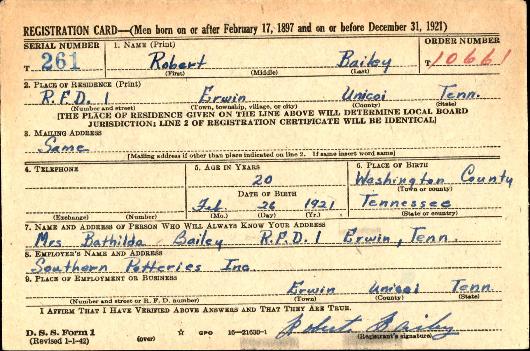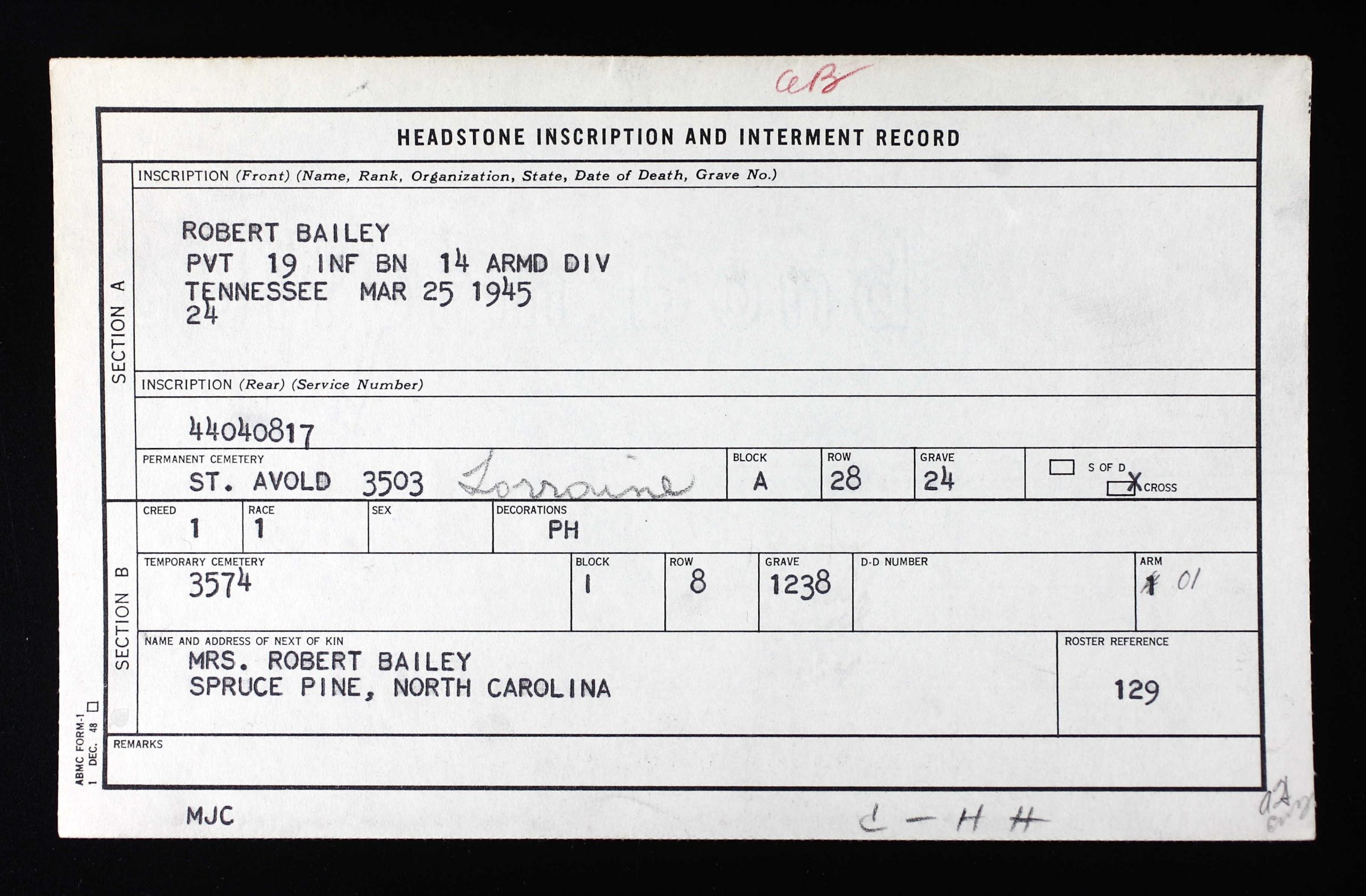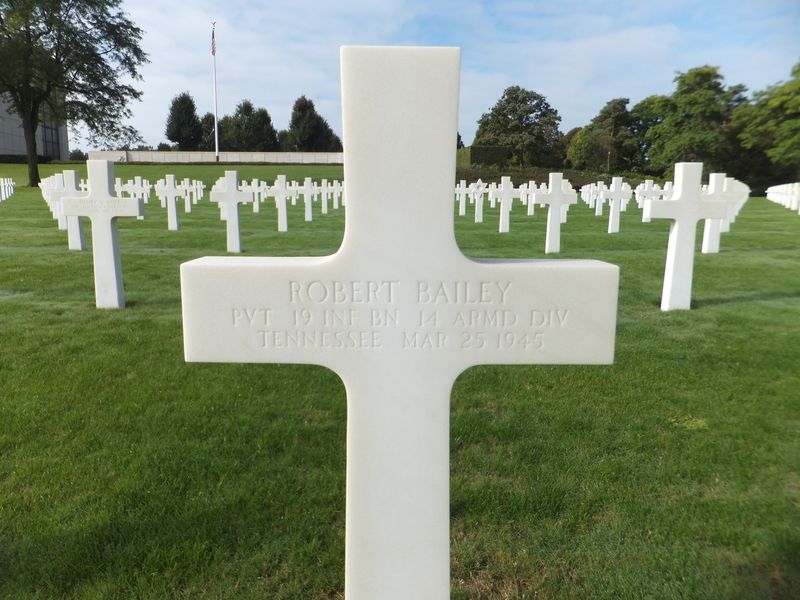 Private Robert was assigned to the 19th Infantry Battalion, 14th Armored Division. At the time of his death the 14th Armored Division was involved with breaching the Siegfried Line. He died of wounds on 25 March 1945, and is interred at A,28,24 Lorraine American Cemetery, St Avold, France.