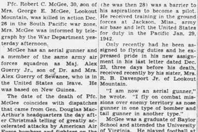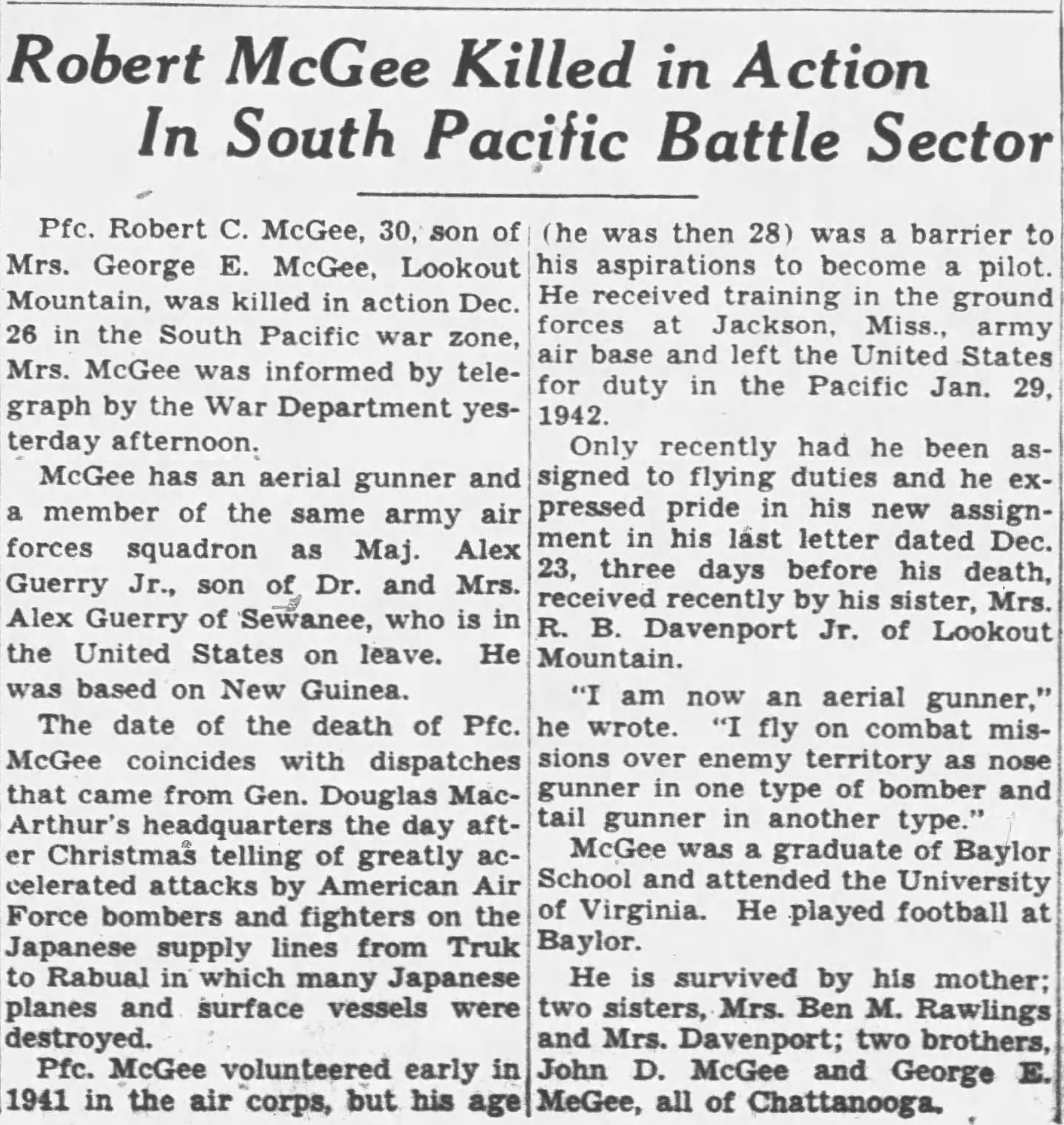 Private First Class Robert C. (Bobby) McGee, ID 34141064, was killed in action in 1943. He enlisted on 13 June 1941 at Fort Oglethorpe in Georgia. He was a crewmember on B-17E “R.F.D. Tojo” Serial Number 41-2627 and this bomber crashed off the northwest end of the runway near the Laloki River in the Pacific in 1943.