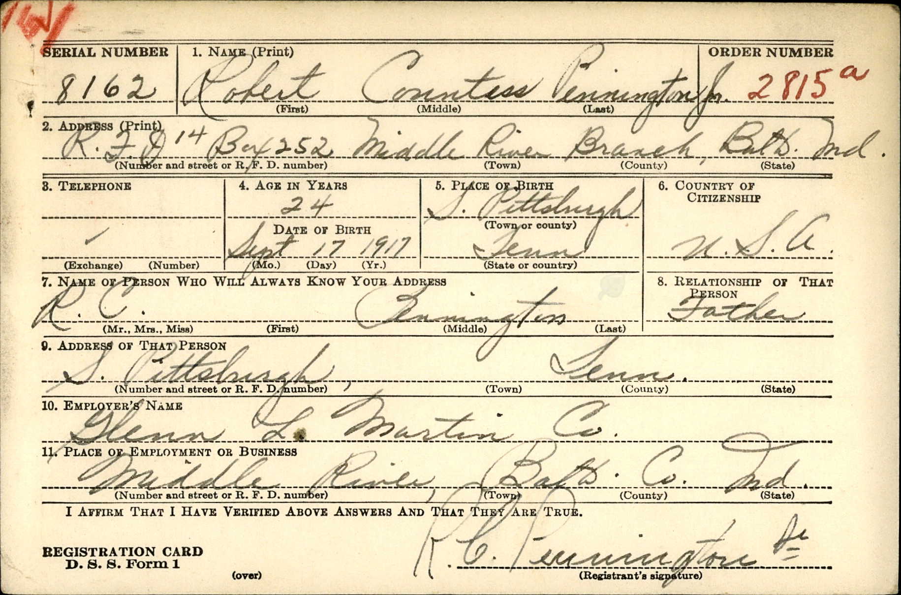 Robert Countis Pennington Jr. was the son of Robert Countiss Penington and Emma Jane Hull.
