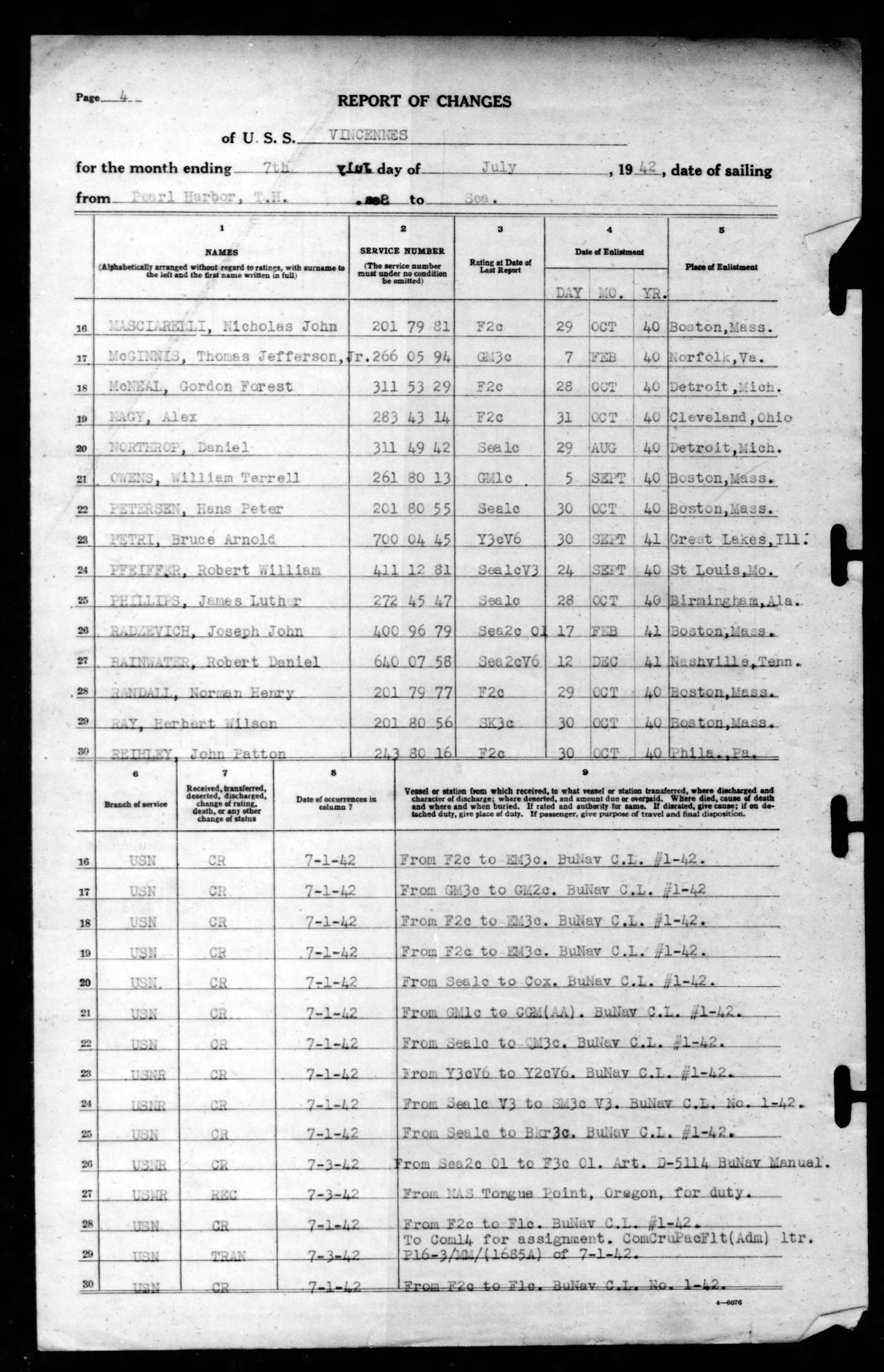 Robert Rainwater was transferred from NAS Tongue Point in Oregon on 3 July 1942 to serve on the U.S.S. Vincennes (CA 44).