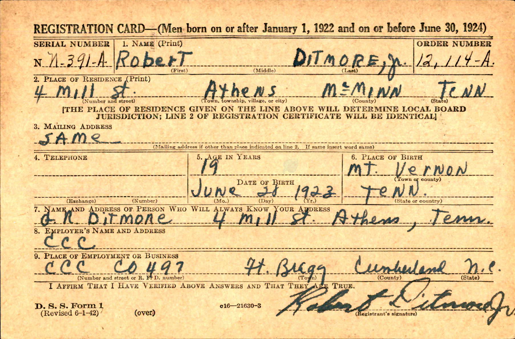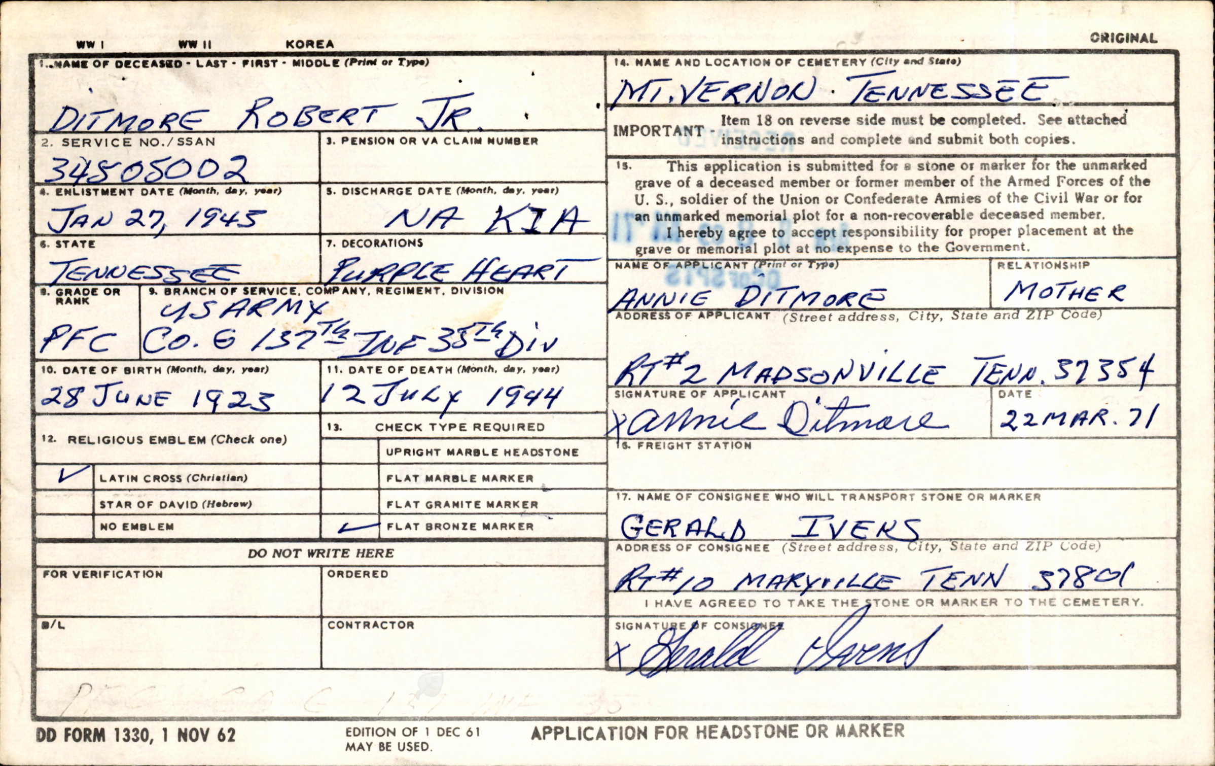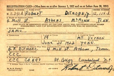 Robert George Ditmore was born in Mt. Vernon, the son of George Robert Ditmore and Annie Jane Ervin. He attended McMinn County High school and enlisted on 27 July 1943.