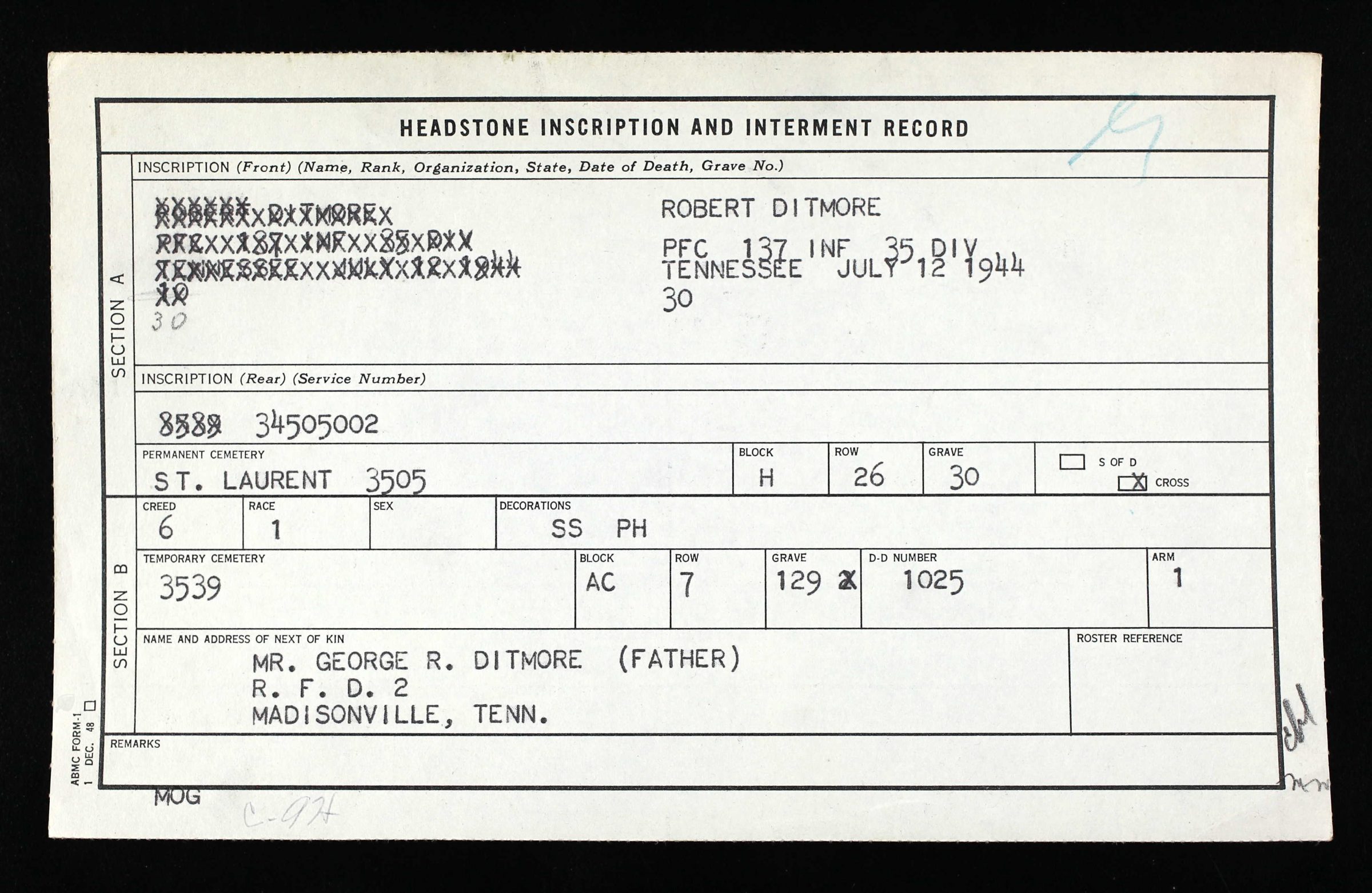 PFC Ditmore is buried at Normandy American Cemetery, Colleville-sur-Mer, France, Plot H, Row 26, Grave 30