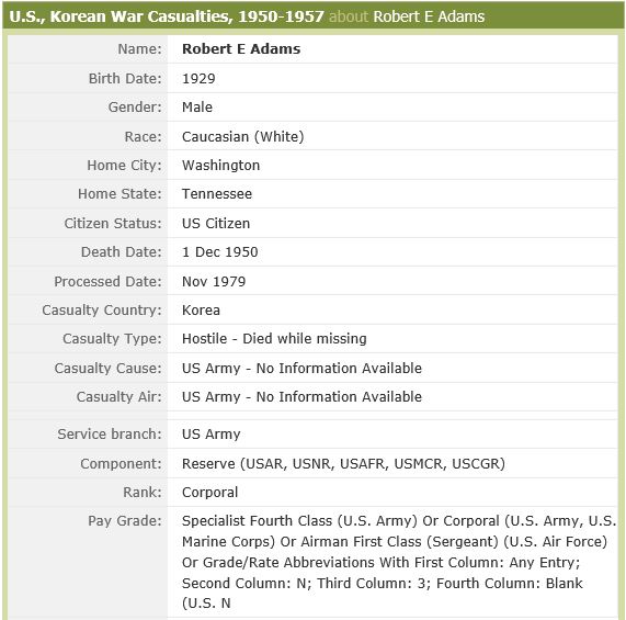 Robert was born in Johnson City, Washington County, Tennessee on 1 March 1929. He lived in the Midway Community, a small community between Johnson City and Jonesborough. Robert attended Midway School prior to enlisting in the United States Army and being assigned to a unit in Germany. He returned home after that assignment and reenlisted, thus enabling him to bring a very special friend named Kitty home to Tennessee to be his wife, but before that could happen, he had to complete a tour of duty in Korea first.