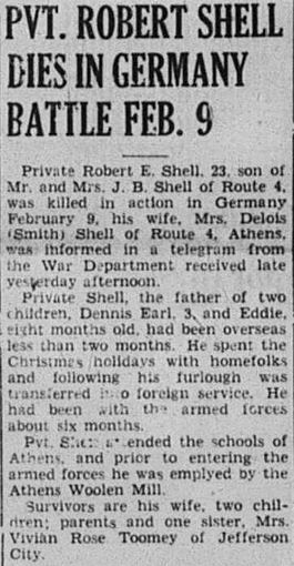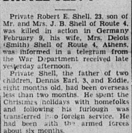 Private Robert E. Shell, 23, son of Mr. and Mrs. J.B. Shell of Route 4, was killed in action in Germany February 9, his wife, Mrs. Delois (Smith) Shell of Route 4, Athens, was informed in a telegram from the War Department received late yesterday afternoon.