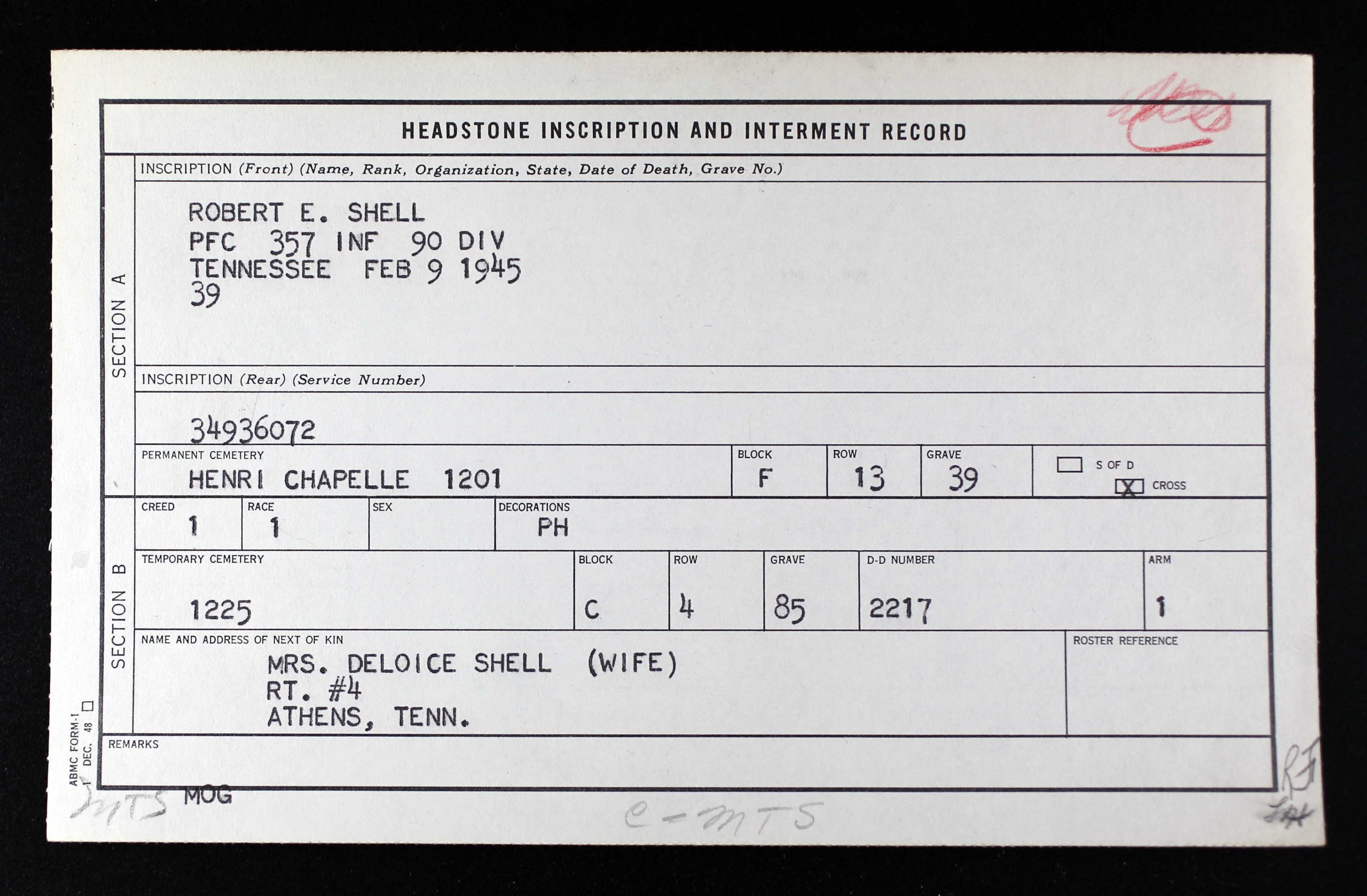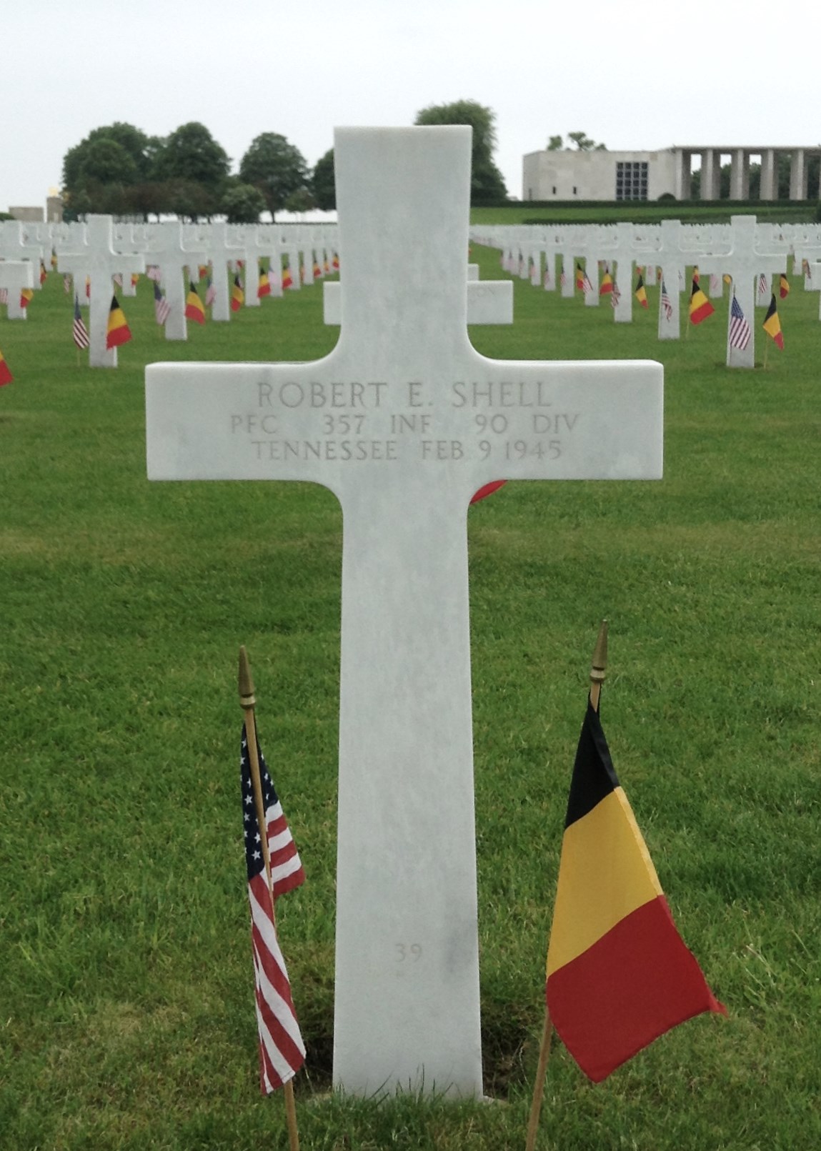 Robert Shell was initially buried at Foy Cemetery at Bastogne, Belgium and reburied at Henri-Chapelle American Cemetery, Belgium, F, 13, 39