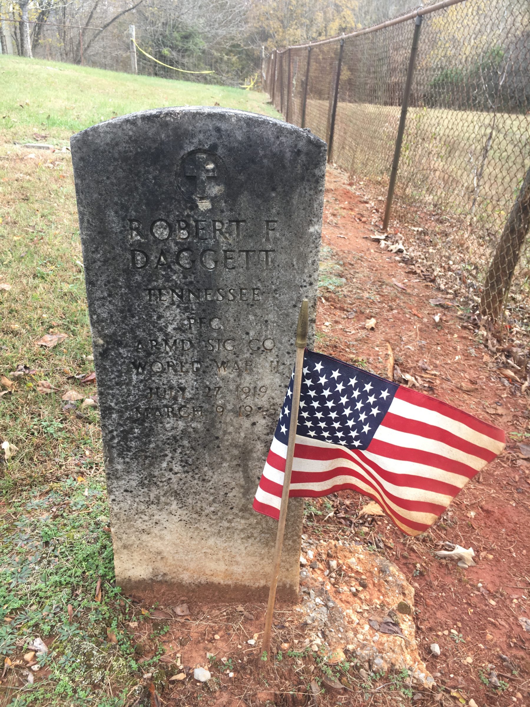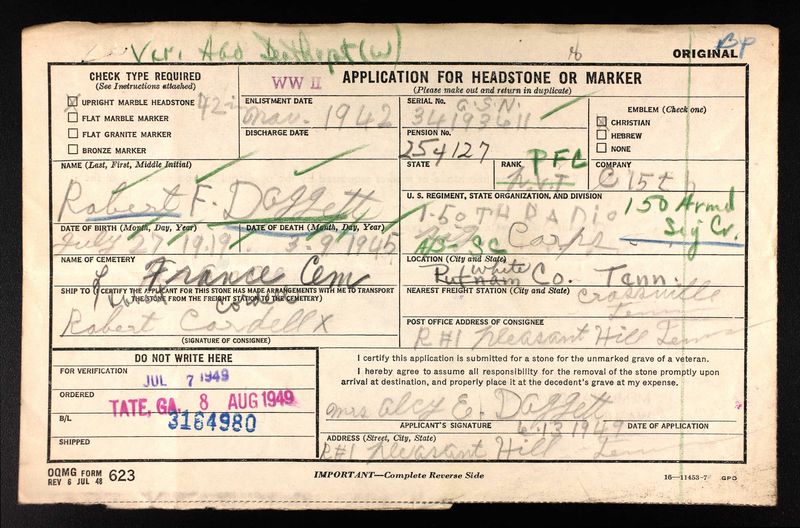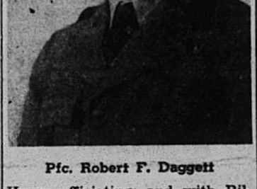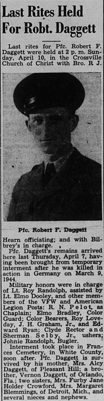 Last rites for Pfc. Robert F. Daggett were held at 2 p.m. Sunday, April 10, in the Crossville church of Christ. Pfc. Daggett’s remains arrived here last Thursday, April 7, having been brought from temporary interment after he was killed in action in Germany on March 9, 1945. Interment took place in France Cemetery in White County, soon after. Pfc. Daggett is survived by his mother, Mrs. Aley Daggett of Pleasant Hill; a brother, Vernon Daggett of Orlando, Fla.; two sisters, Mrs. Furby Jane Holder Crowford, Mrs. Margaret Blemmings of Detroit, Mich., and several nieces and nephews.