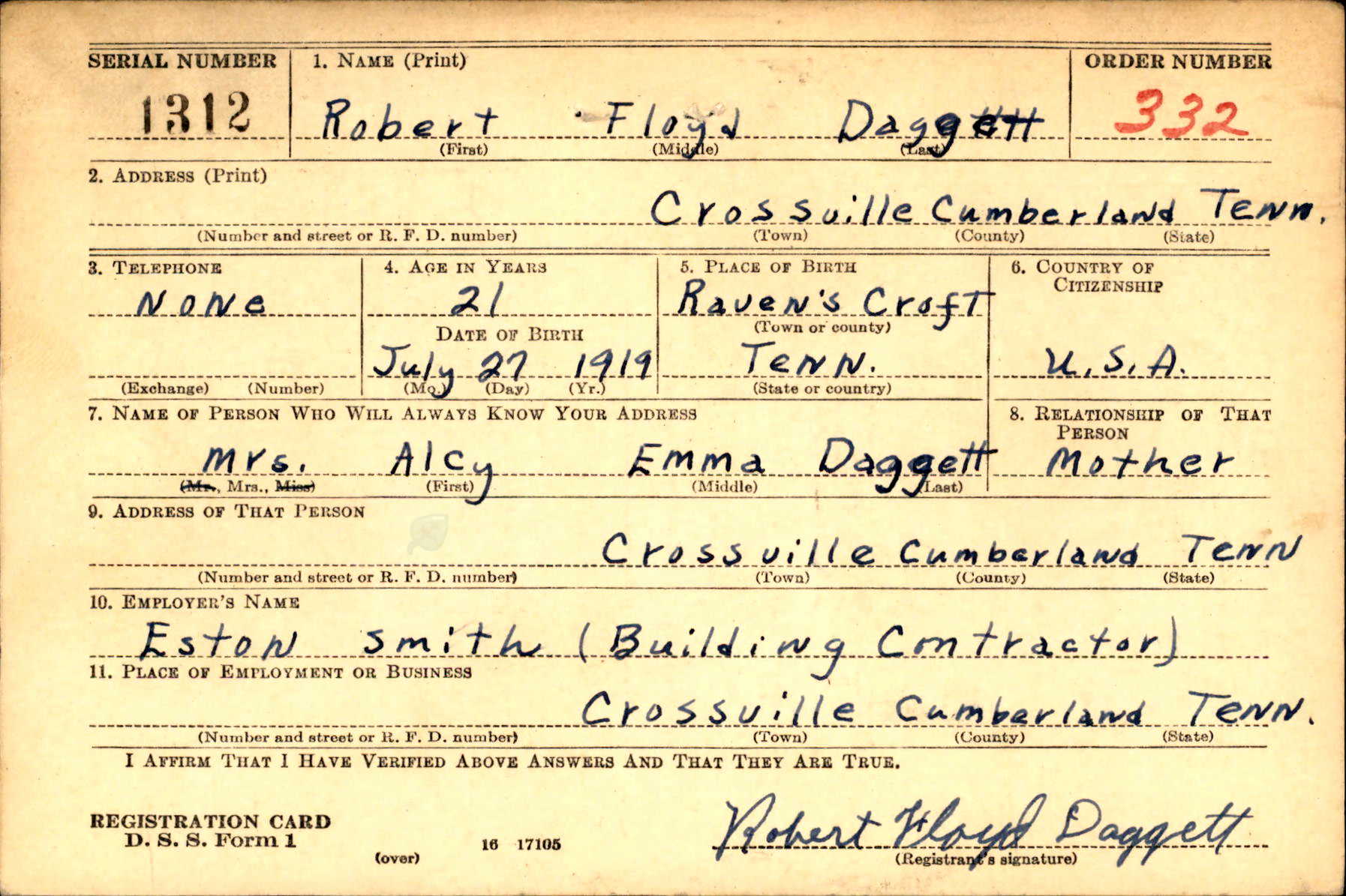 Robert Floyd Daggett was born on 27 July 1919 at Raven’s Croft, Tennessee, the son of Mrs Alcy Emma Daggett .