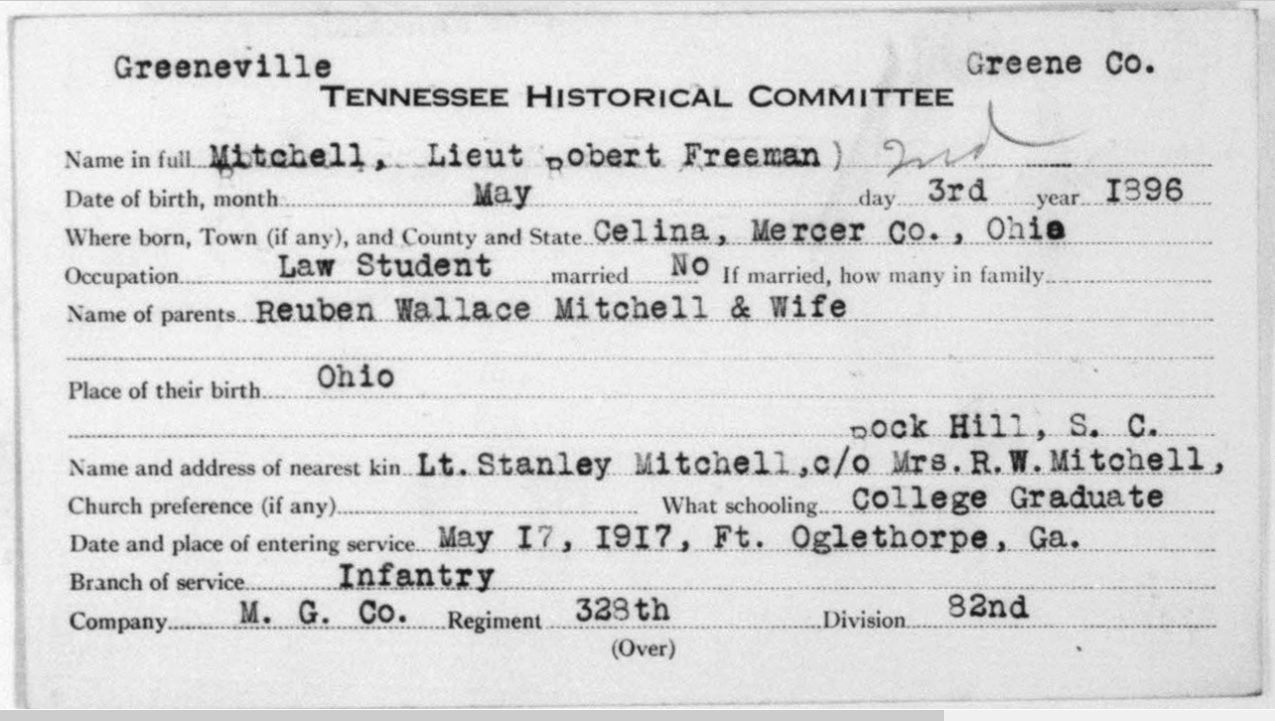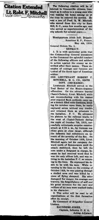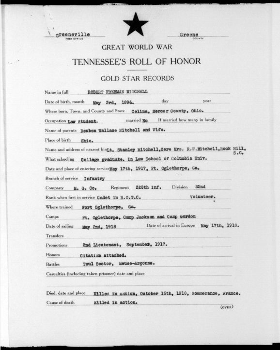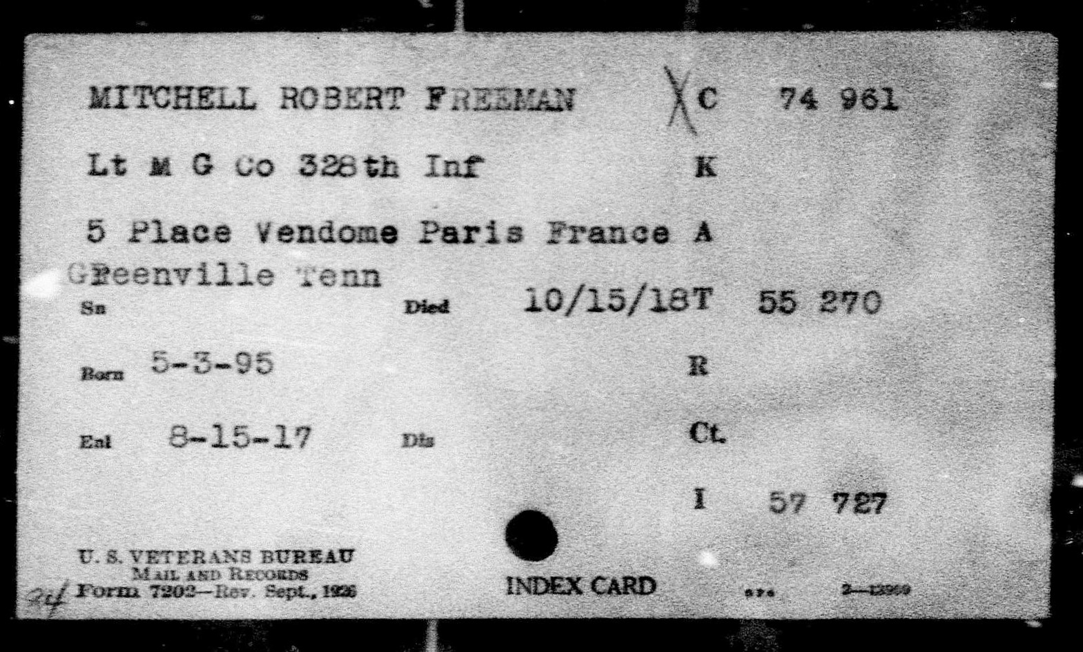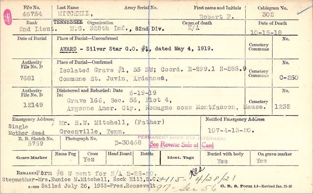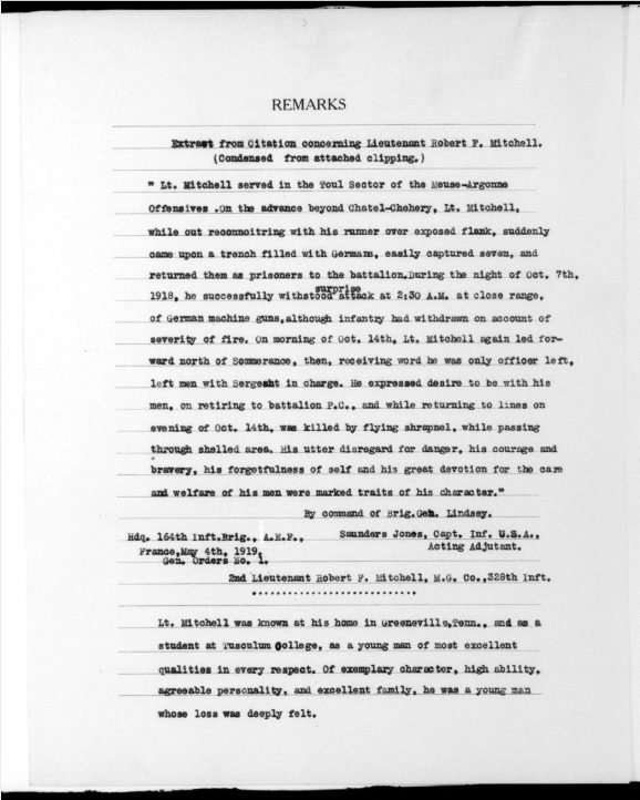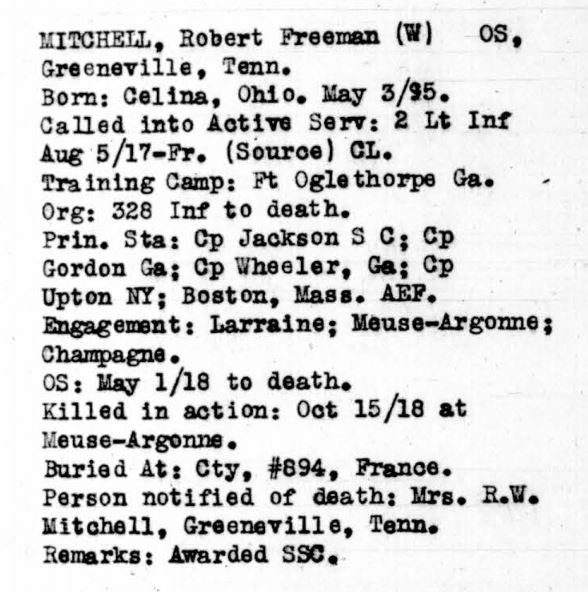 Robert Freeman Mitchell was born in Celina, Ohio. He was killed in action at Sommerance on 15 October 1918 by flying shrapnel while passing through a shelled area and initially buried at an isolated grave at Commune St-Juvin, Ardennes. He is buried plot B, row 44, grave 18, Meuse-Argonne American Cemetery, Romagne, France.