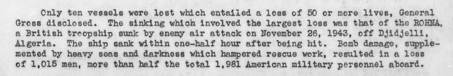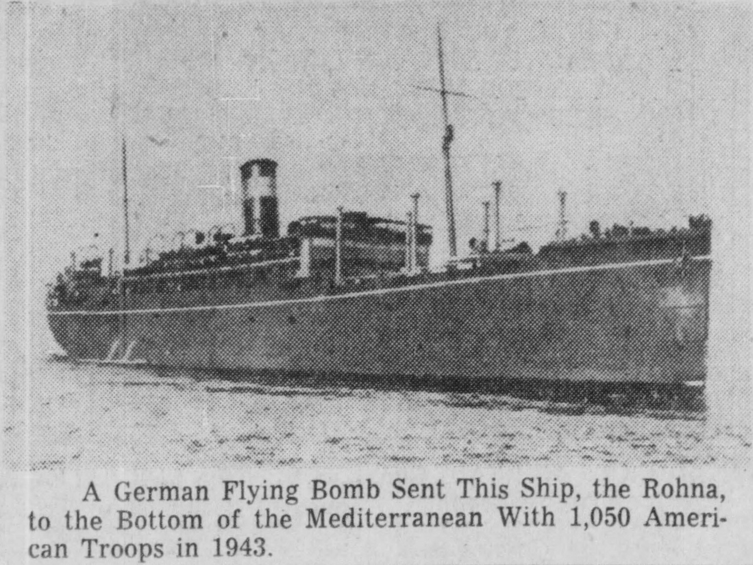 The HMT Rohna, a British vessel carrying American troops, was hit by a German missile in 1943 off the coast of Algeria, North Africa. The ship sank within one-half hour after being hit. Bomb damage, supplemented by heavy seas and darkness which hampered rescue work, resulted in a loss of 1,015 men, more than half of the total 1,981 American military personnel aboard.