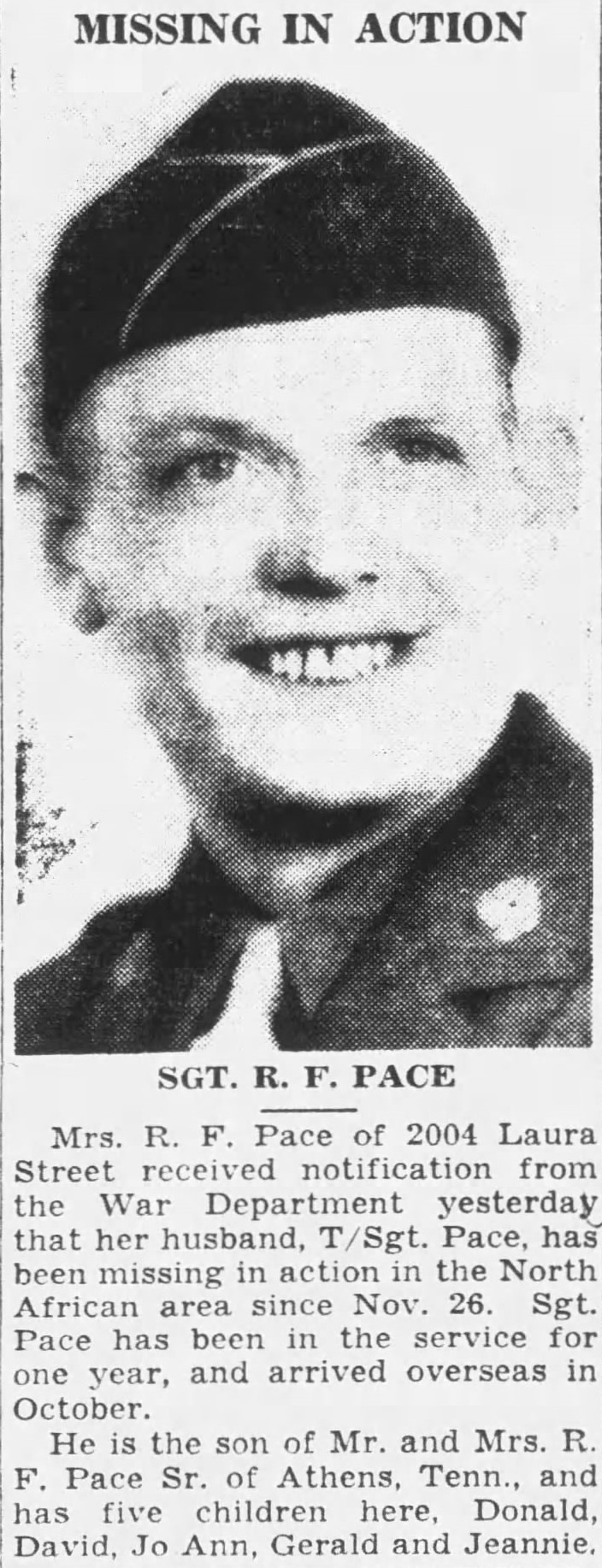 Mrs. R.F. Pace of 2004 Laura Street received notification from the War Department yesterday that her husband, T/Sgt Pace has been missing in action in the North African area since Nov 26. Sgt. Pace has been in the service for one year, and arrived overseas in October. He is the son of Mr. and Mrs. R.F. Pace, Sr. of Athens, Tenn., and has five children here, Donald, David, Jo Ann, Gerald and Jeannie.