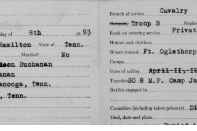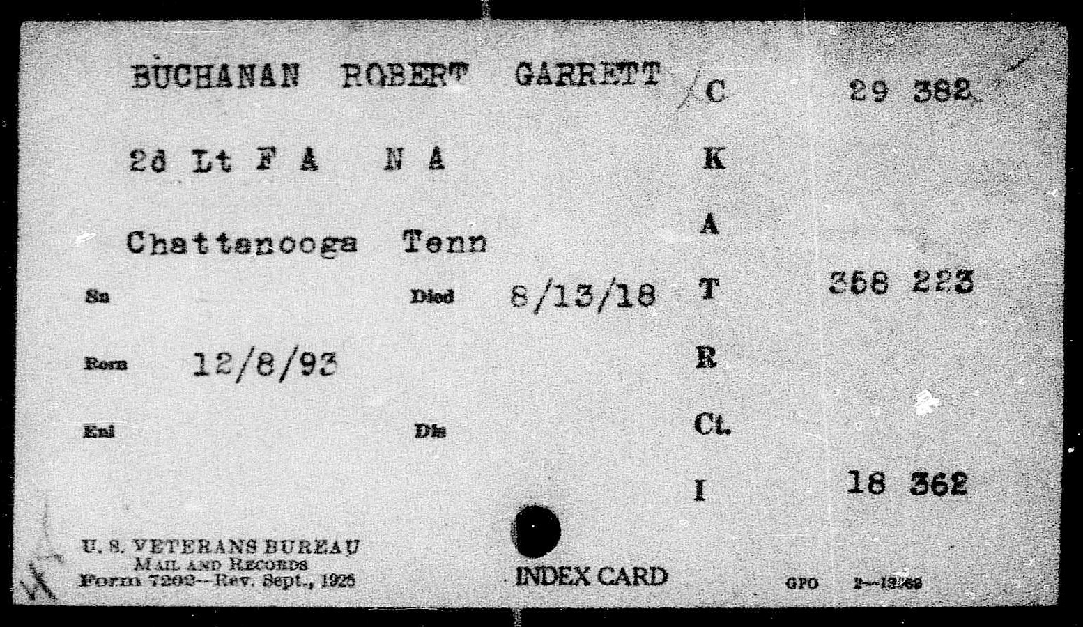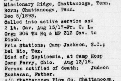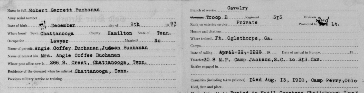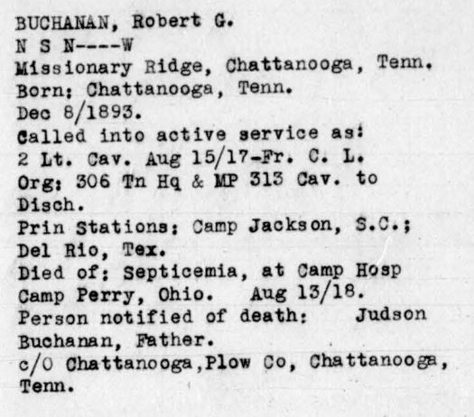 Robert Garrett Buchanan was born in 1893 in Chattanooga, Tennessee to Judson and Angie Coffey Buchanan. He received training at Camp Oglethorpe in Georgia and was transferred from 308th M.P. at Camp Jackson in South Carolina to the 313th Cavalry. He died of Septicemia on August 13, 1918 at Camp Perry in Ohio