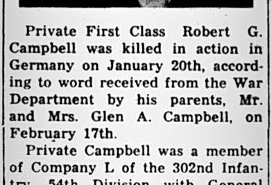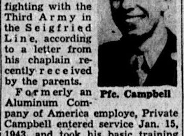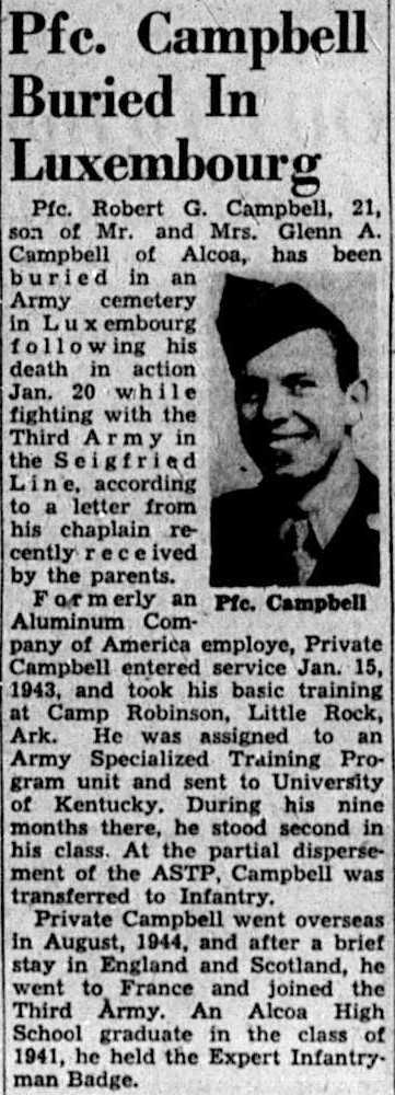Pfc. Robert G. Campbell, 21, son of Mr. and Mrs. Glenn A. Campbell of Alcoa, has been buried in an Army cemetery in Luxembourg following his death in action Jan. 20, while fighting with the Third Army in the Siegfried Line, according to a letter from his chaplain, recently received by his parents. Formerly an Aluminum Company of America employe, Private Campbell entered service Jan. 15, 1943, and took his basic training at Camp Robinson, Little Rock, Ark. He was assigned to an Army Specialized Training Program unit and sent to the University of Kentucky. During his nine months there, he stood second in his class. At the Partial dispersement of het ASTP, Campbell was transferred to Infantry. Private Campbell went overseas in August, 1944, and after a brief stay in England and Scotland, he went to France and joined the Third Army. An Alcoa High School graduate in the class of 1941, he held the Expert Infantryman Badge.