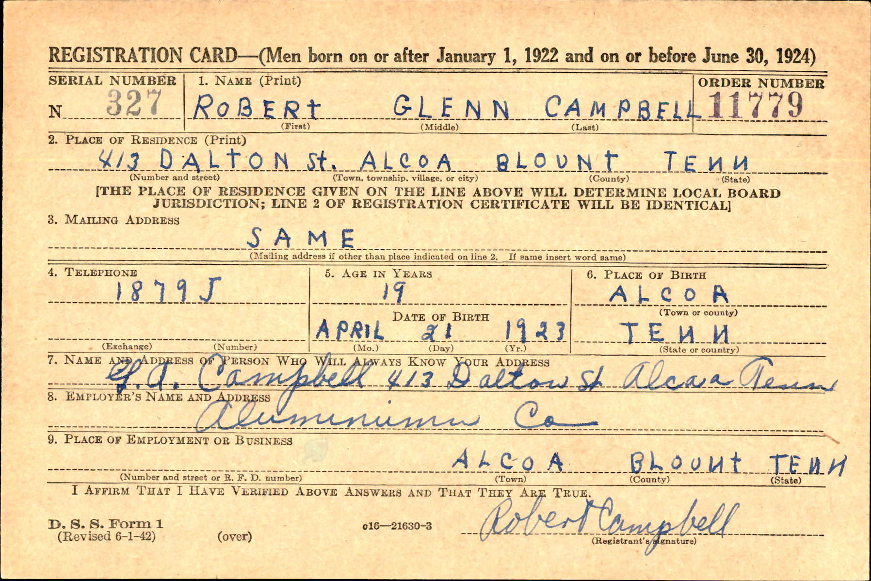 Robert Glenn Campbell was born at Alcoa, Tennessee, the son of Glenn Alvin Campbell and Clara B. Galbraith.
