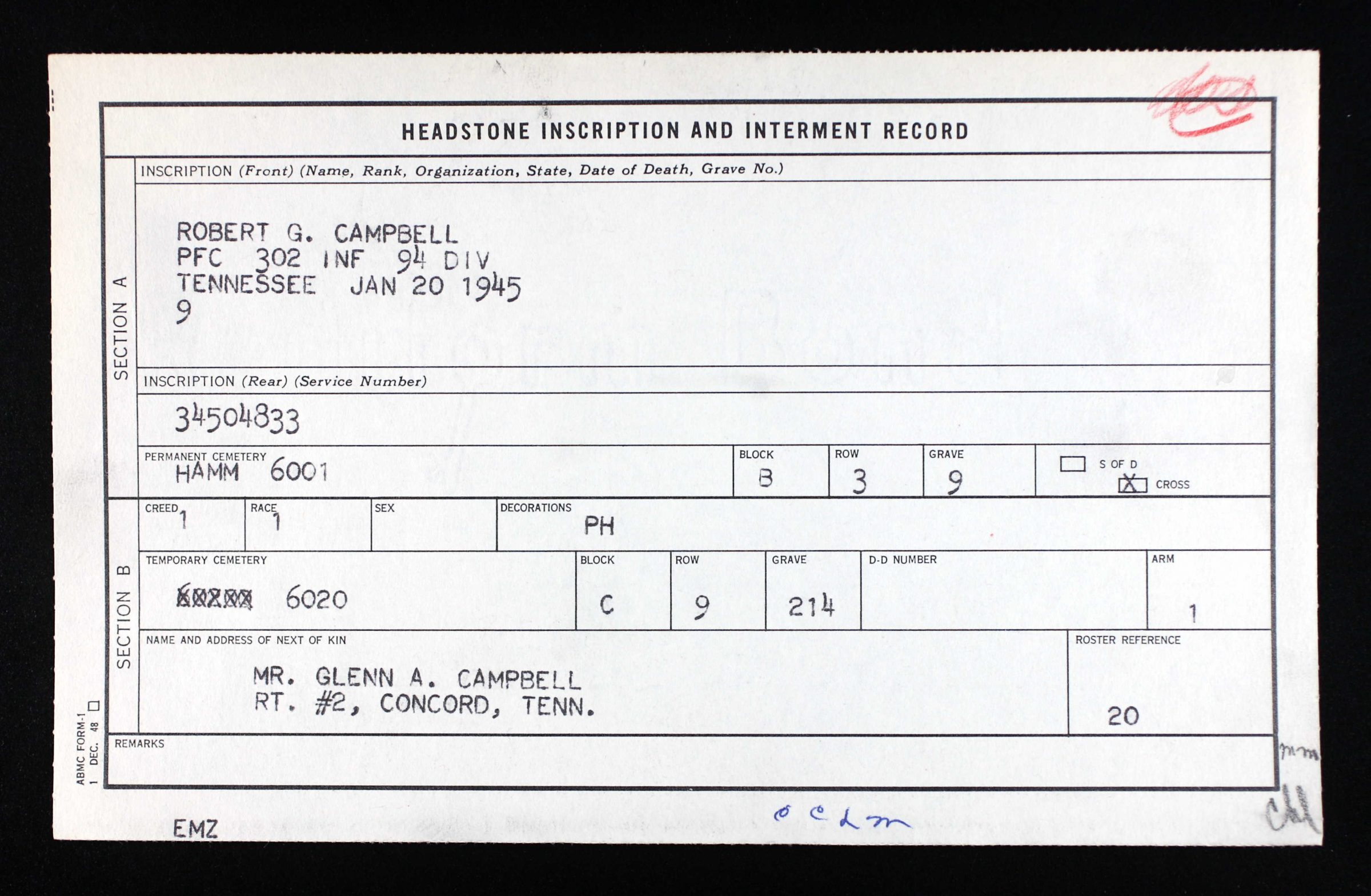 - Burial/Memorial Location: Luxembourg American Cemetery, Luxembourg City, Luxembourg