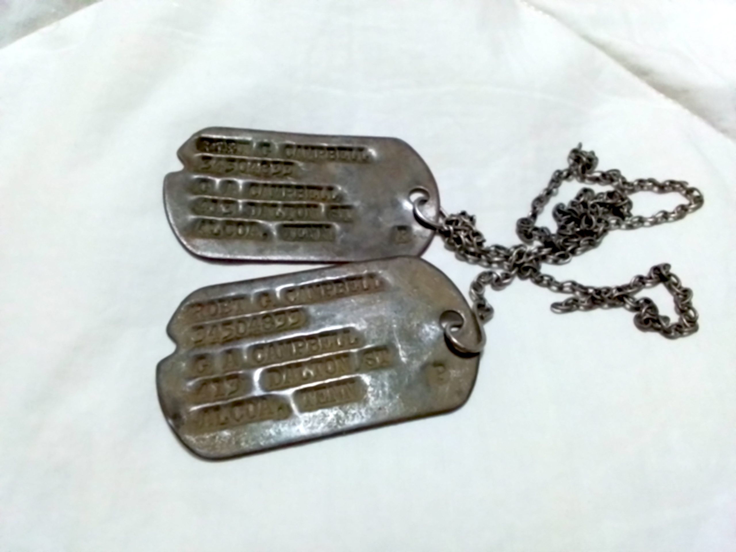 Good afternoon. I have a question I wondered if you could help me with. In 1973 I was using a metal detector on the campus of the University of Kentucky. I unearthed a set of dog tags for Robt G Campbell of Alcoa, TN. I have held on to them ever since and recently came across them again and wondered if there might be any family that would be interested in receiving them. From information on your site, it appears Mr. Campbell died and was buried in Luxembourg in 1945. I didn’t know if you might have information as to whether any of his family may still be in the Alcoa TN area as I will actually be going through the area on February 27th.