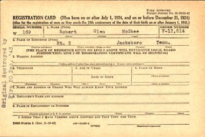 Robert Glen McGhee was born on 4 July 1927, the son of Russell M. McGhee and Mary Lydia Burris. Stepson of Athur Victor Greenwood.