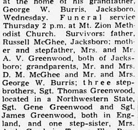 Survivors: father, Russell McGhee, Jacksboro; mother and stepfather, Mr. and Mrs. A.V. Greenwood, both of Jacksboro; grandparents, Mr. and Mrs. D.M. McGhee and Mr. and Mrs. George W. Burris; three stepbrothers, Sgt. Thomas Greenwood, located in a Northwestern State, Sgt. Gene Greenwood and Sgt. James Greenwood, both in England and one step-sister, Mrs. Andy Goodwin, Tampa, Fla.
