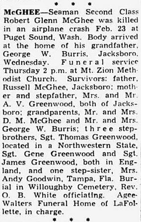 Seaman Second Class Robert Glenn McGhee was killed in an airplane crash Feb. 23 at Puget Sound, Wash. Body arrived at the home of his grandfather, George W. Burris, Jacksboro, Wednesday. Funeral service Thursday at Mt. Zion Methodist Church.