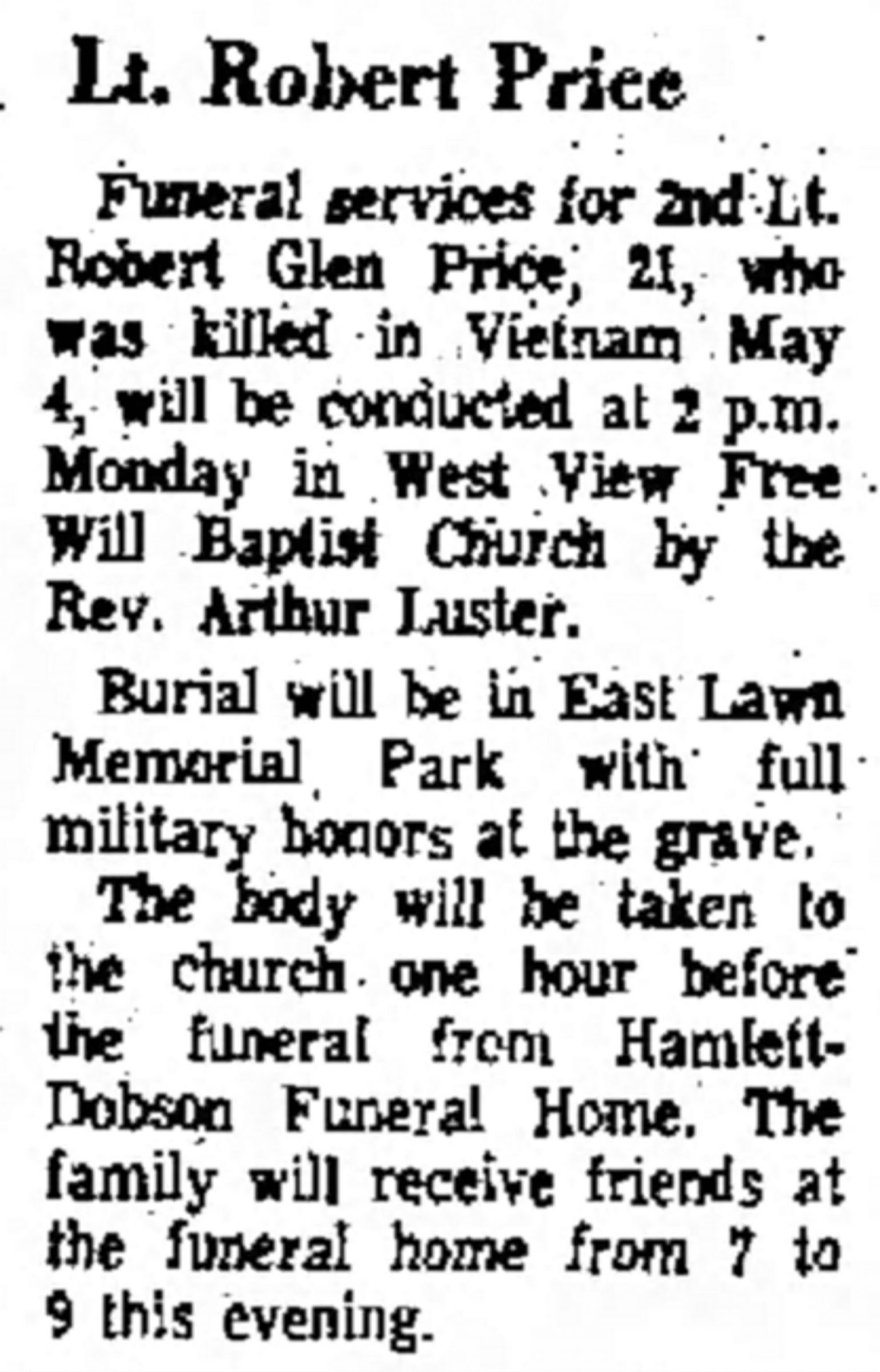 Funeral service for 2nd Lt Robert Glen Price, 21, who was killed in Vietnam May 4, will be conducted at 2 p.m. in West View Free Will Baptist Church by the Rev. Arthur Luster.