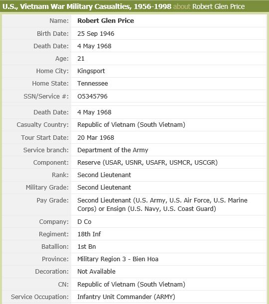 Price was the husband of Mrs. Shirley G. Price of Church Hill and the son of Mr. and Mrs. John R. Price of Kingsport. He was a graduate of Kingsport Dobyns-Bennett High School. Price had been in the Army about one year and had served in Vietnam less than two months.