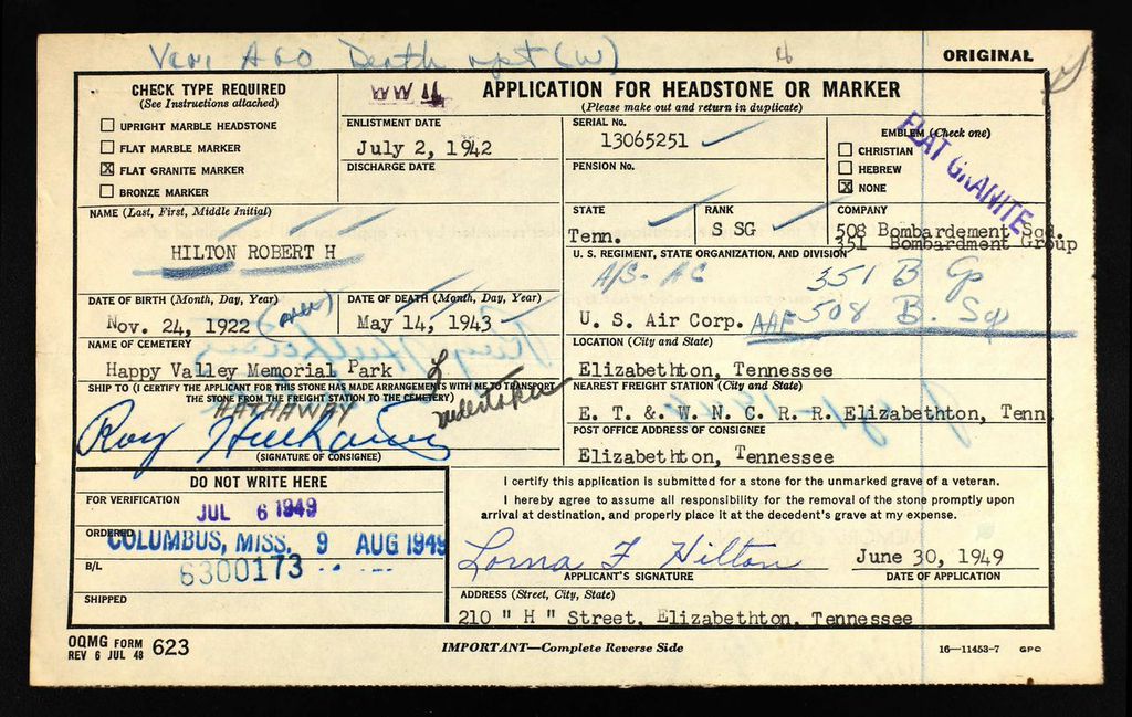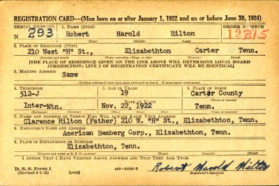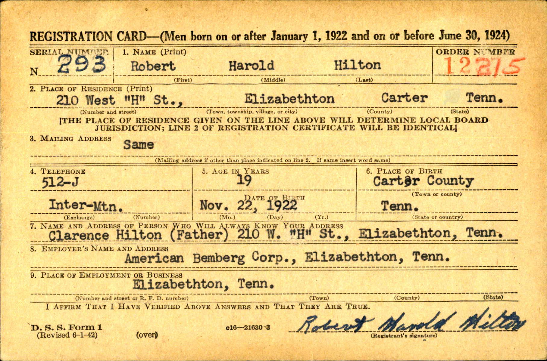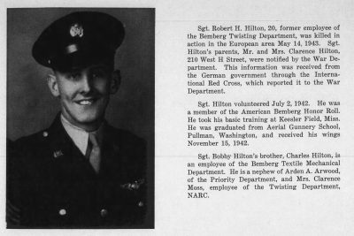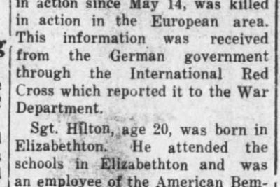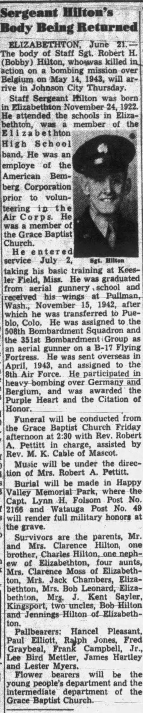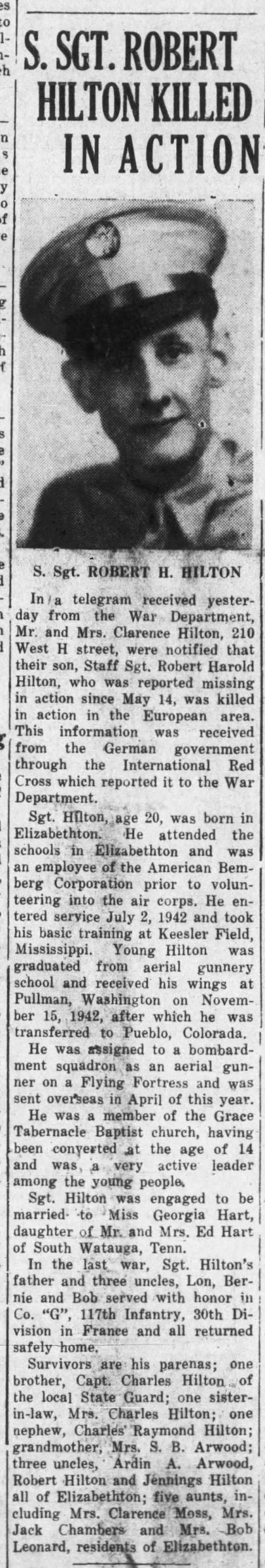 In a telegram received yesterday from the War Department, Mr. and Mrs. Clarence Hilton, 210 West H. street, were notified that their son, Staff Sgt. Robert Harold Hilton, who was reported missing in action since May 14, was killed in action in the European area. This information was received from the German government through the International Red Cross which reported it to the War Department. Sgt. Hilton, age 20, was born in Elizabethton. He attended the schools in Elizabethton and was an employee of the American Bemberg Corportation prior to volunteering into the air corps. He entered service July 2, 1942 and took his basic training at Keesler Field, Mississippi. Young Hilton was graduated from aerial gunnery school and received his wings at Pullman, Washington on November 15, 1942, after which he was transferred to Pueblo, Colorada. He was assigned to a bombardment squadron as an aerial gunner on a Flying Fortress and was sent overseas in April of this year. He was a member of the Grace Tabernacle Baptist church, having been converted at the age of 14 and was a very active leader among the young people. Sgt. Hilton was engaged to be married to Miss Georgia Hart, daughter of Mr. and Mrs. Ed Hart of South Watauga, Tenn. In the last war, Sgt. Hilton’s father and three uncles, Lon, Bernie and Bob served with honor in Co. “G”, 117th Infantry, 30th Division in France and all returned safely home.