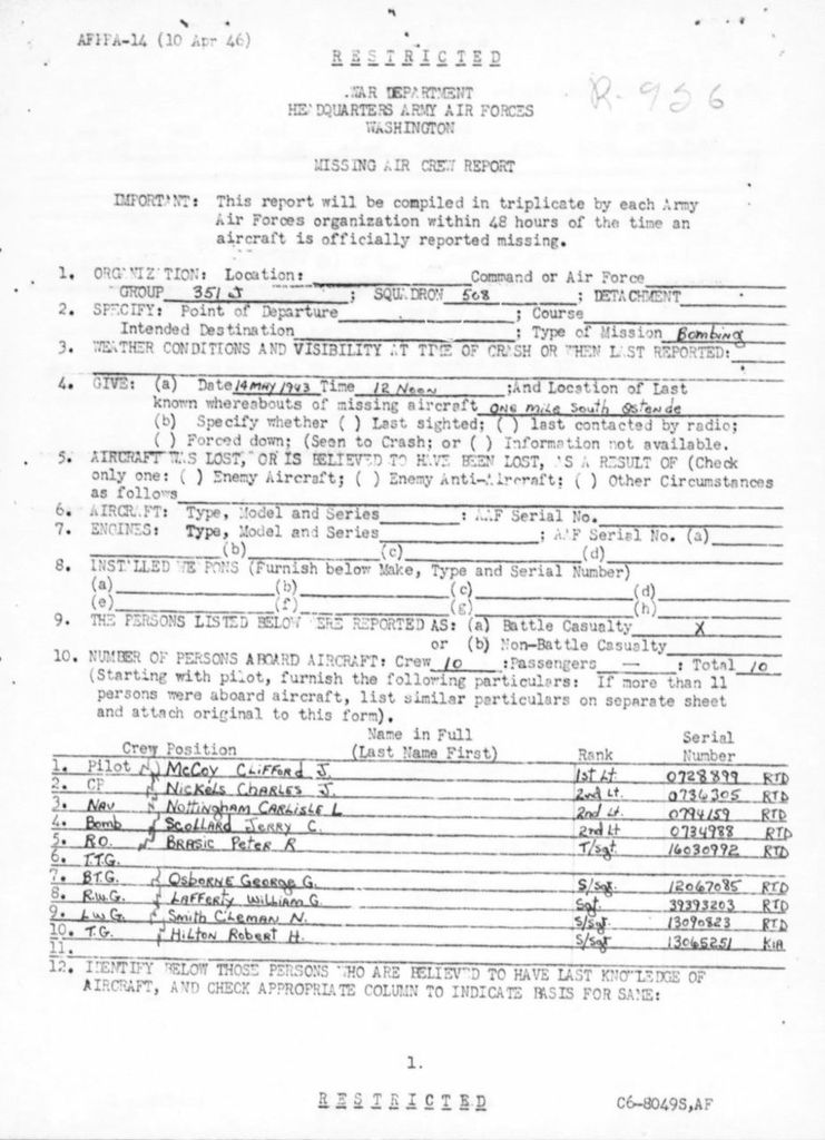 Staff Sergeant Hilton was the Tail Gunner on aircraft 42-29862. The aircraft was on a bombing mission to Courtrai, Belgium and was shot down by fighters near Ostende, Belgium.