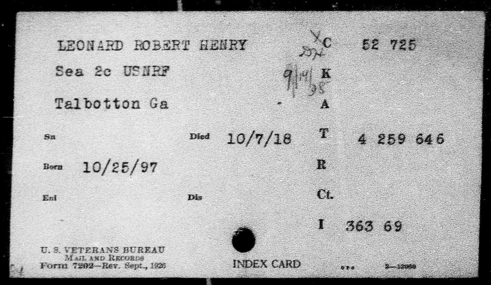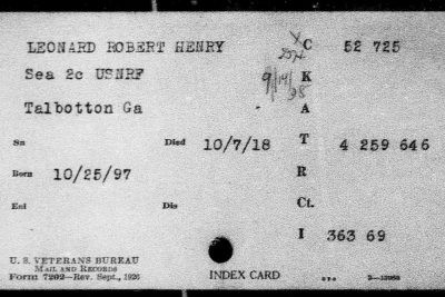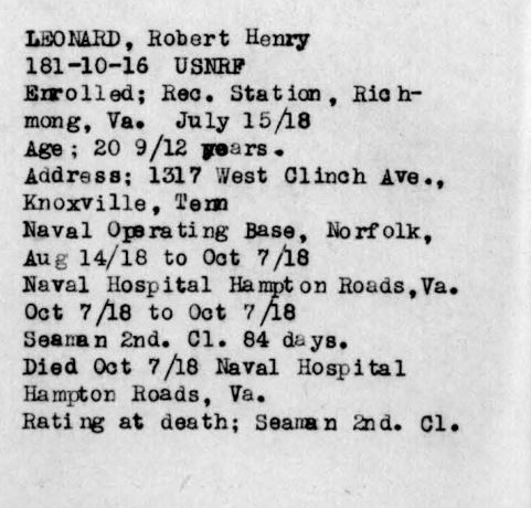 Robert Henry Leonard offered his services to the government on September 11, 1918, enlisting in the Navy. He was assigned to Company 137, Unit X, at the U.S. Naval Base, Hampton Roads, VA, where he was sent for training. Shortly after his arrival he was taken ill with influenza, followed by pneumonia. He died October 7, 1918, less than a month after his enlistment.
