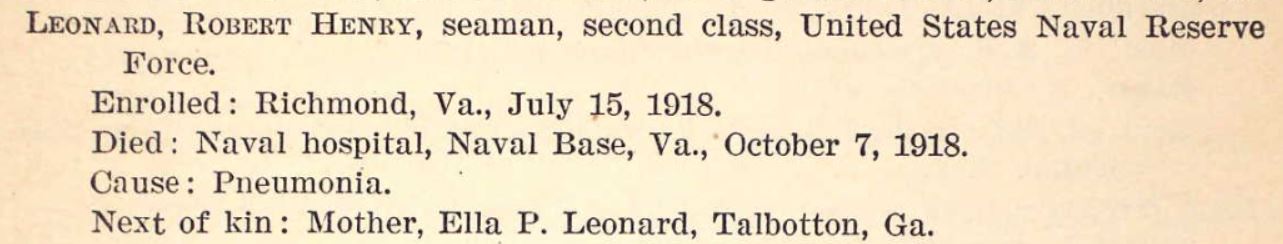 Robert H. Leonard, younger son of Mrs. Ella P. Leonard, passed away in Norfolk Monday morning, having been ill but a short while. Robert was a victim of Spanish Influenza. Robert volunteered for the U.S. Navy a few months ago and was stationed at Hampton Roads, Va. Robert was born and reared in Talbotton he spent most of his young life here he was unusually intelligent, and a most lovable character. Perhaps no young man who has been reared in the county had more friends than Robert he was held in the highest esteem by all who knew him, and a large circle of friends and relatives truly mourn his death. Robert had just reached his majority and he was a splendid specimen of manhood. His remains reached Talbotton this a.m. at 11 o’clock the funeral and interment took place from the train, and he rests in Oak Hill Cemetery. Rev. L.A. Brown conducted the funeral. Dr. Haywood J. Pierce, president of Prenau college, attended the funeral and paid a glowing tribute to Robert’s manhood and unselfishness. The floral offerings bespoke the high esteem and love of his many relatives and friends. All of the business houses in Talbotton closed in honor of his memory, and the funeral was largely attended. Surviving Robert are his mother, Mrs. Ella P. Leonard, one brother, J. T. Leonard and a large family connection.