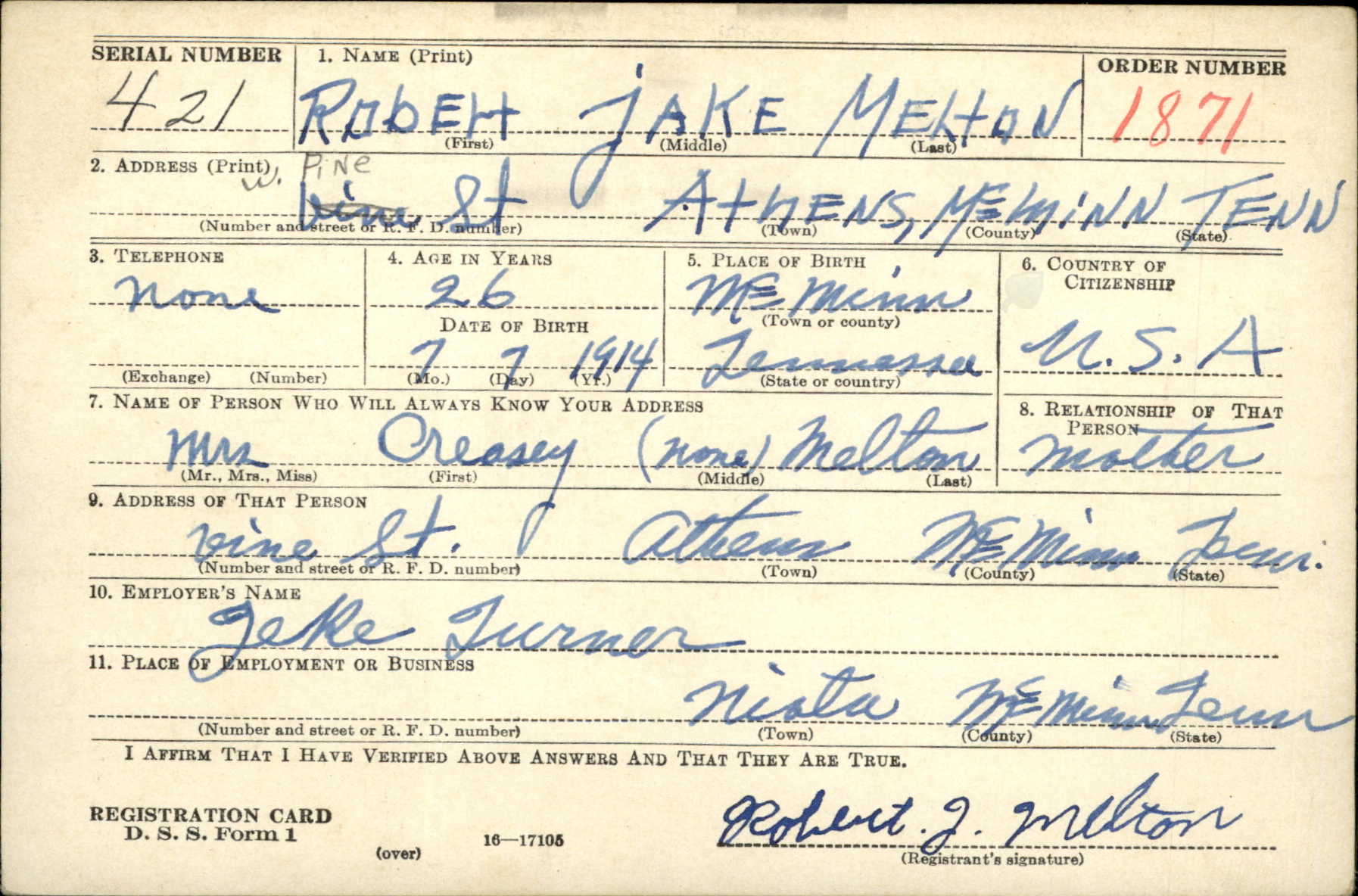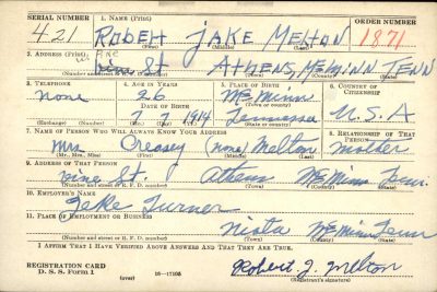 Robert Jake Melton was the son of William Horace Melton and Lucretia “Creasie” Adaline Sanders. Pfc. Melton had been in service two years and overseas six months. He was killed in action in France. Survivors besides his mother, are two sisters, Mrs. Floyd Huff and Lizzie Flowers. He was employed by a transfer firm before he entered the Army.