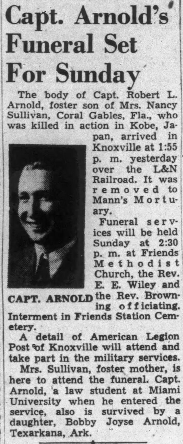 The body of Capt. Robert L. Arnold, foster son of Mrs. Nancy Sullivan, Coral Gables, Fla., who was killed in action in Kobe, Japan, arrived in Knoxville yesterday over the L&N Railroad. It was removed to Mann’s Mortuary. Funeral services will be held at Friends Methodist Church. Interment in Friends Station Cemetery. Mrs. Sullivan, foster mother, is here to attend the funeral. Capt. Arnold, a law student at Miami University when he entered the service, also is survived by a daughter, Bobby Joyce Arnold, Texarkana, Ark.