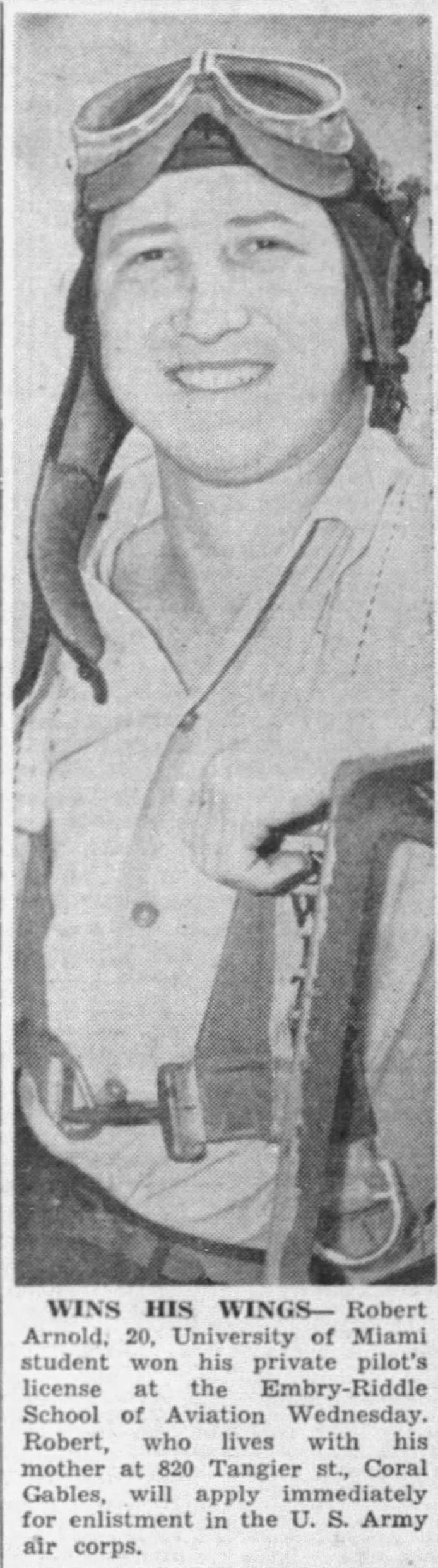 Within 40 hours of flight training of his commission as a second lieutenant in the army air forces, Aviation Cadet Robert L. Arnold, son of Mrs. Nancy Arnold, 820 Tangier St., Coral Gables, was injured in a crash at Ellington Field, Texas. He lost four months of training while recuperating. But like other American boys he went back just as soon as able and it’s now 2nd Lt. Arnold, having gained his commission and wings as a pilot. He is now at Sebring in combat service. Lt. Arnold is a graduate of the Miami Senior High School and of the University of Miami law school. His mother expects him home on furlough next month.