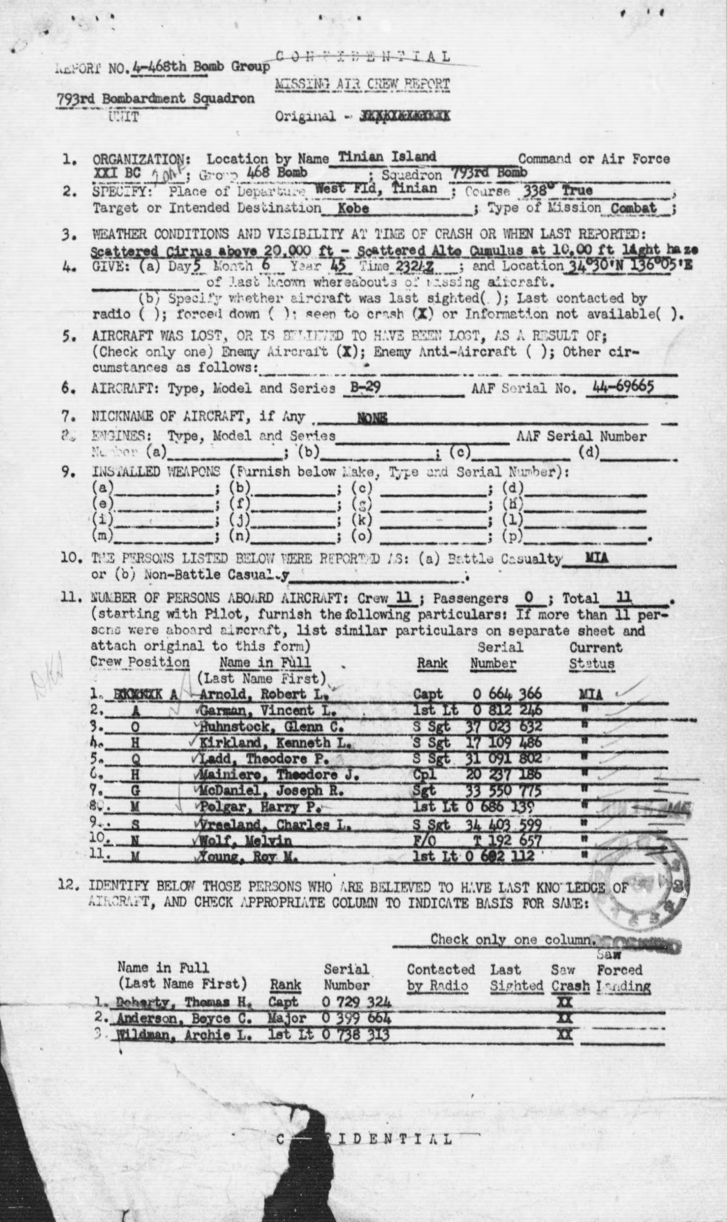 69665 was shot down by Japanese fighter June 5, 1945 over Shorenji Nabari City Mie, Japan, while on mission to Kobe. MACR 14390. 2 Crew were KIA, 9 bailed out and became POW. 3 Died in captivity and 6 were executed.