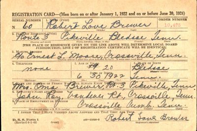 Robert Brewer was the son of Lewis Montgomery (Akin) Brewer and Lula Naomi (Oma) Wilson.