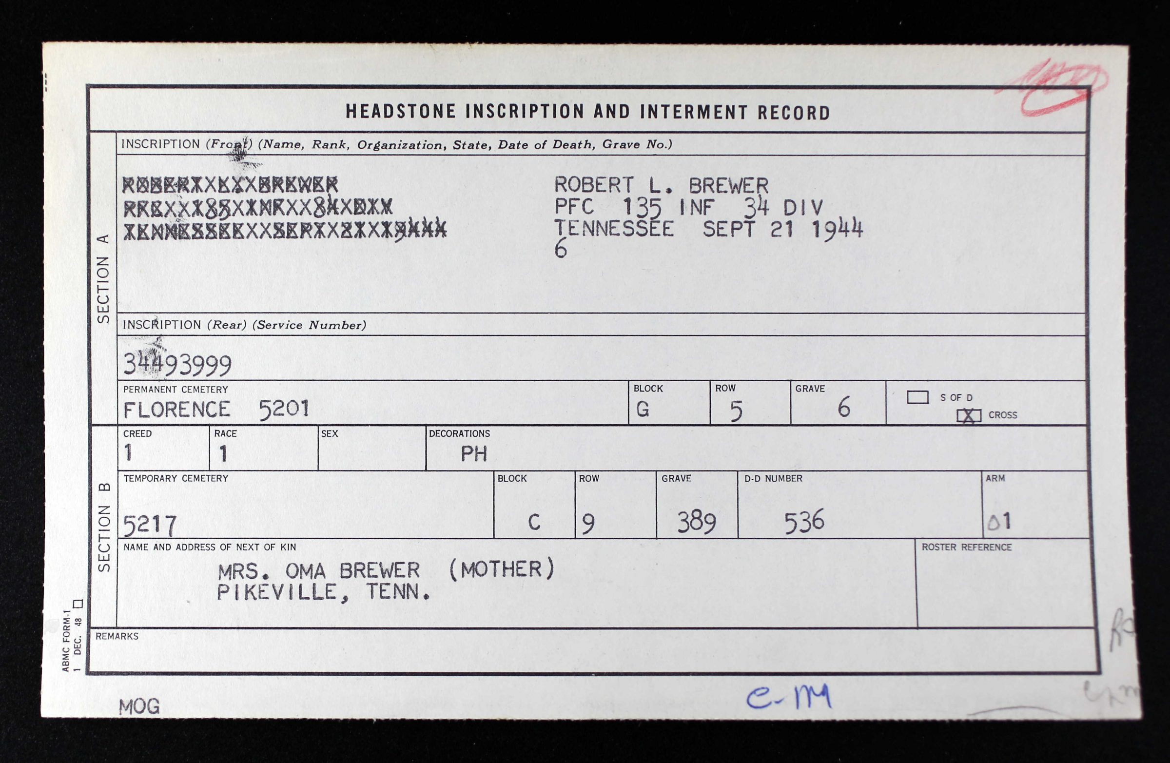 Private First Class Robert L. Brewer was assigned to the 135th Infantry Regiment, 34th Infantry Division. At the time of his death the 135th IR was assaulting the Gothic line north Of Florence Italy attempting to get to the Po Valley. PFC Brewer died of wounds received on 21 September 1944. He is interred at G,5,6, Florence American Cemetery, Florence, Italy.