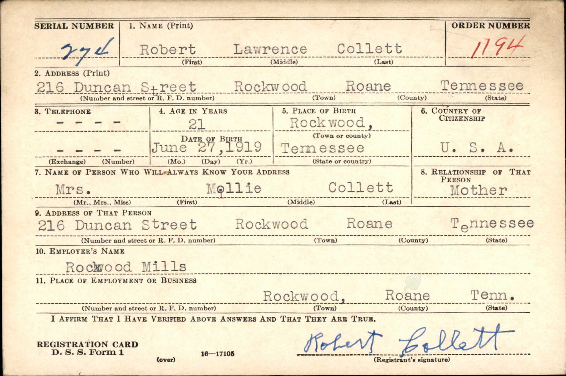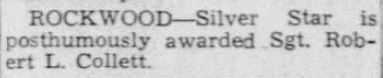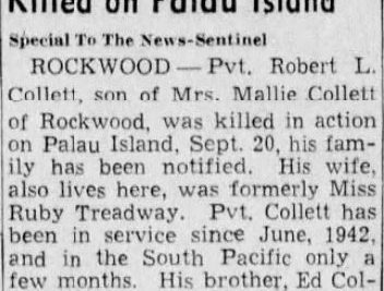 Pvt. Robert L. Collett, son of Mrs. Mallie Collett of Rockwood, was killed in action on Palau Island, Sept. 20, his family has been notified. His wife, also lives here, was formerly Miss Ruby Treadway. Pvt. Collett has been in service since June, 1942, and in the South Pacific only a few months. His brother, Ed Collett, was discharged about two months ago after a year in the South Pacific.