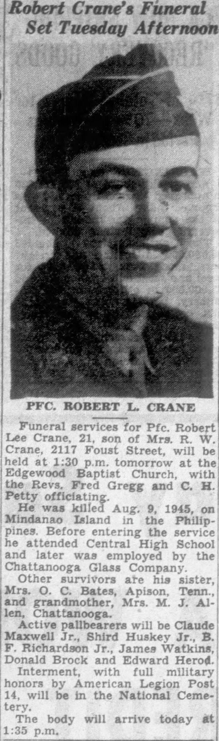 Funeral services for Pfc. Robert Lee Crane, 21, son of Mrs. R.W. Crane, 2117 Foust Street, will be held at the Edgewood Baptist Church. He was killed Aug. 9, 1945 on Mindanao Island in the Philippines. Before entering the service he attended Central High School and later was employed by the Chattanooga Glass Company. Other survivors are his siters, Mrs. O.C. Bates, Apison, Tenn., and grandmother, Mrs. M.J. Allen, Chattanooga.