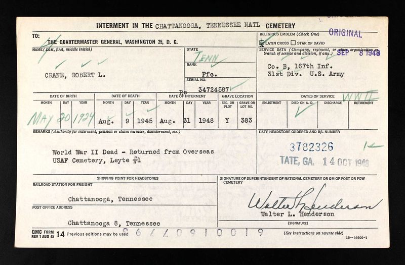 PFC Crane was initially buried at the USAF Cemetery, Leyte #1, Philippines.