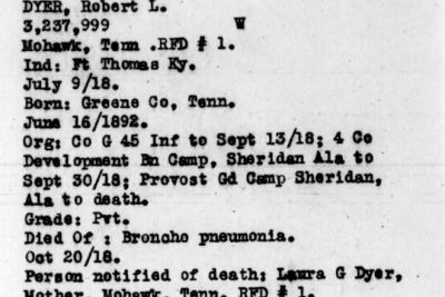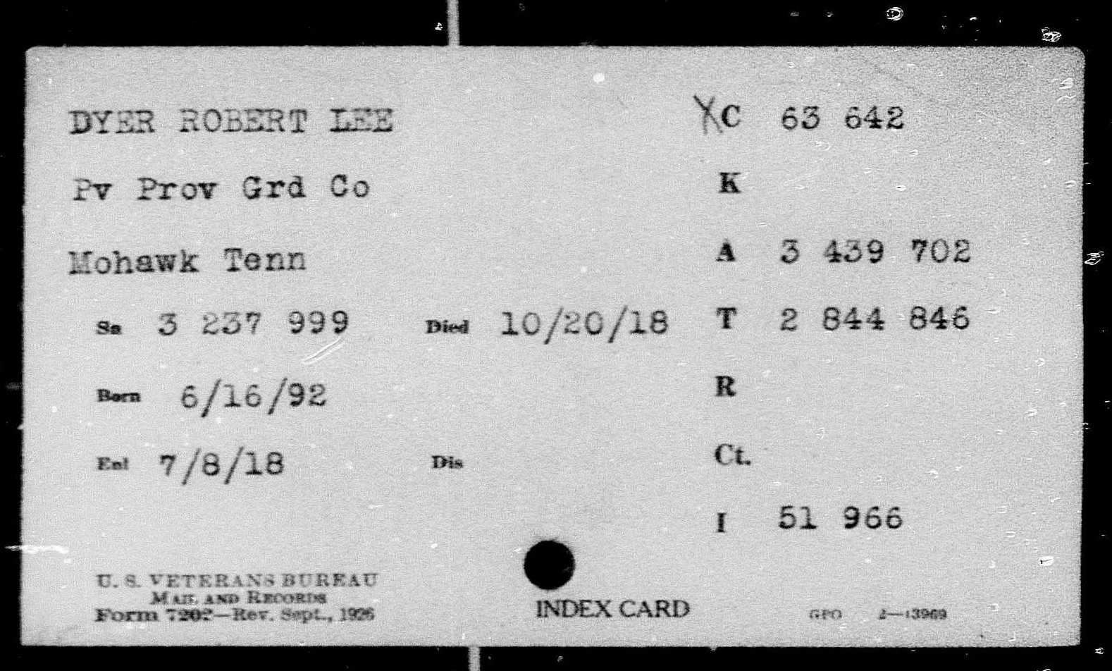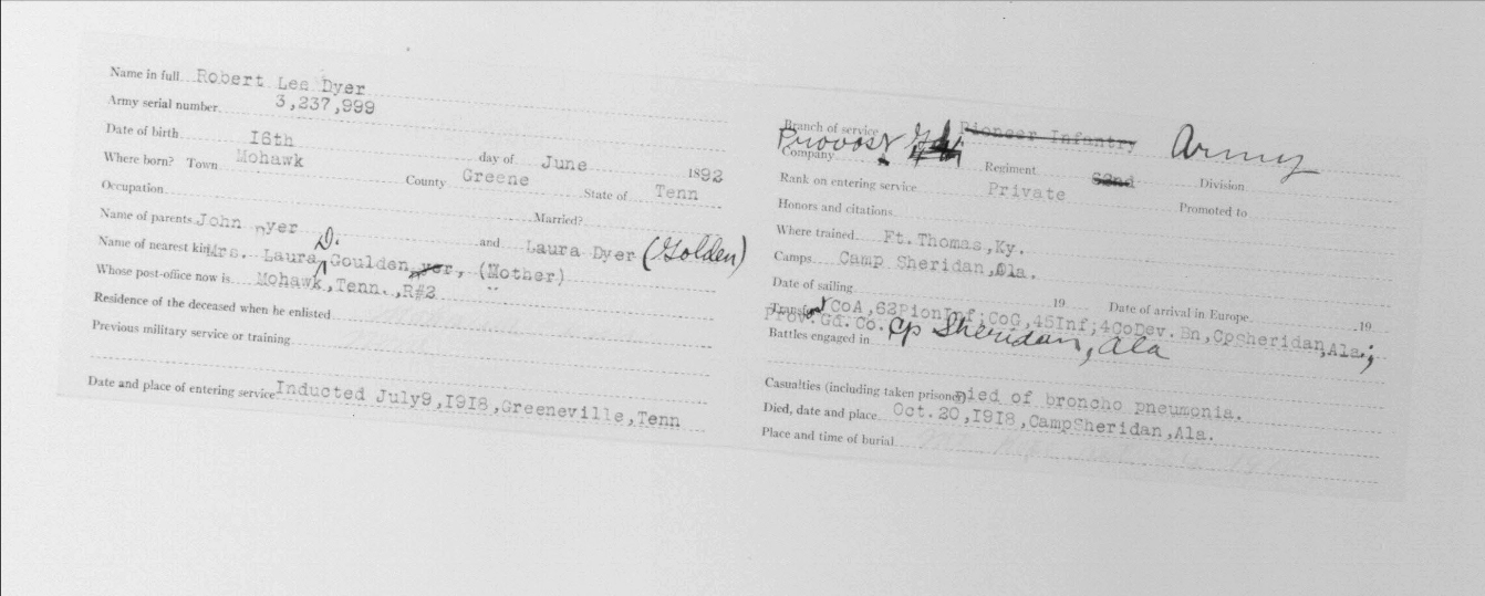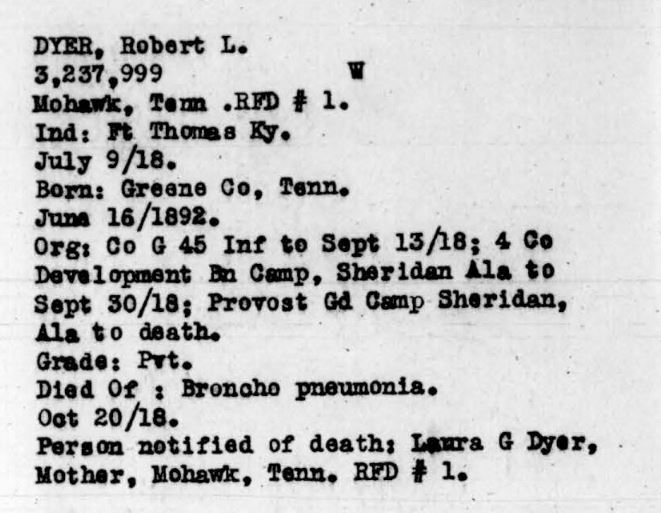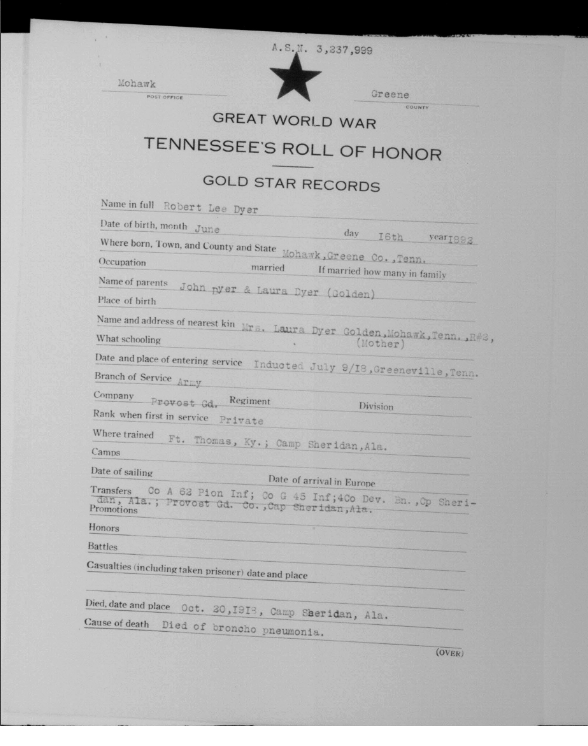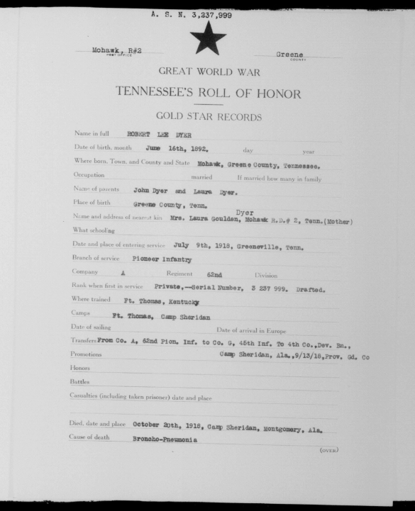 Robert Lee Dyer was born 16 June 1892, Mohawk, Tennessee to John and Laura Dyer. He entered the service on 9 July 1917 at Greeneville and trained at Fort Thomas in Kentucky and Camp Sheridan in Alabama. He died of broncho pneumonia at Camp Sheridan on 20 October 1918.