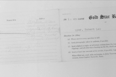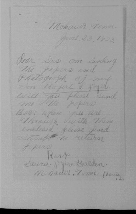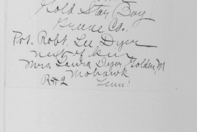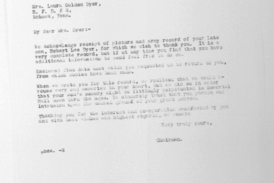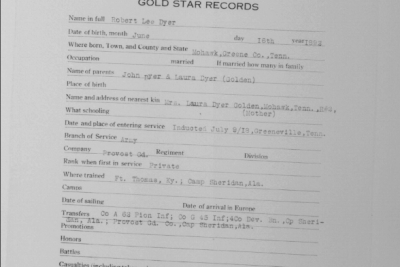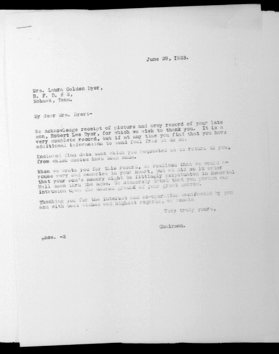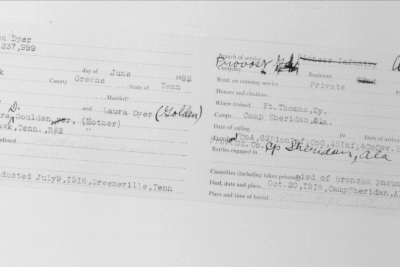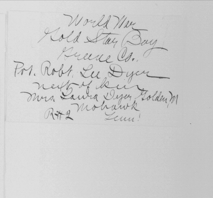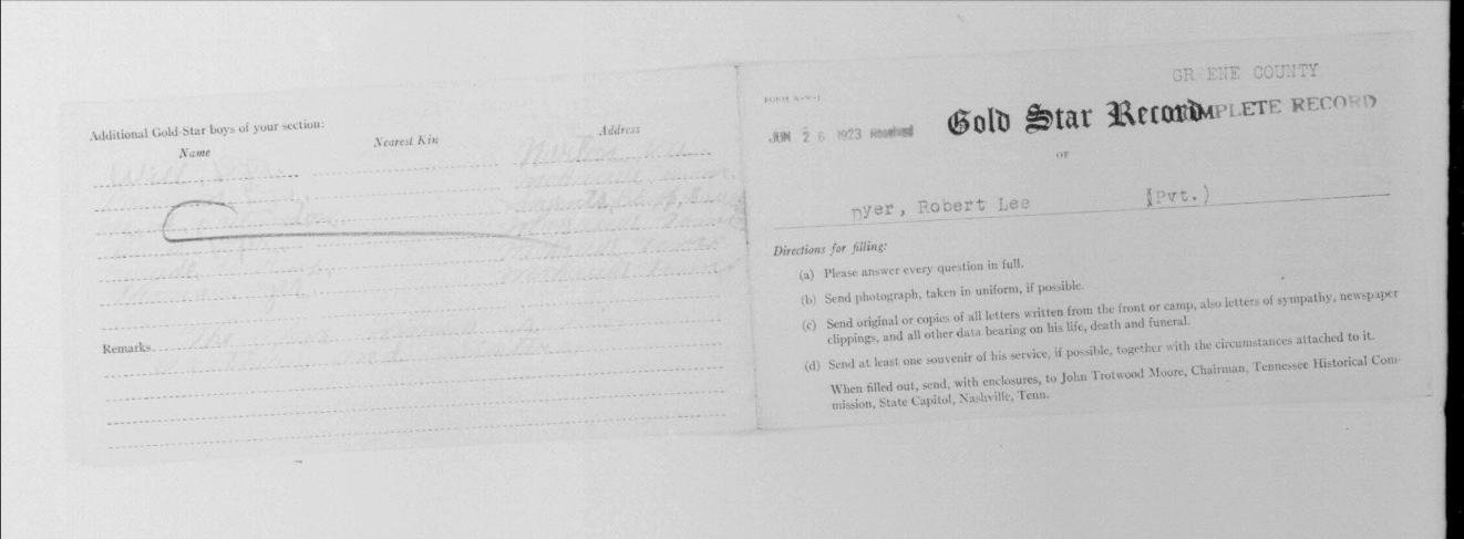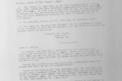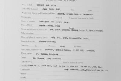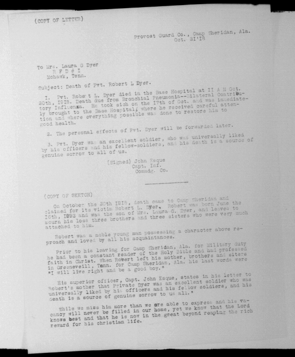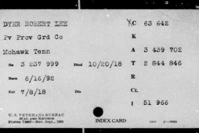 Robert Lee Dyer was born 16 June 1892, Mohawk, Tennessee to John and Laura Dyer. He entered the service on 9 July 1917 at Greeneville and trained at Fort Thomas in Kentucky and Camp Sheridan in Alabama. He died of broncho pneumonia at Camp Sheridan on 20 October 1918.