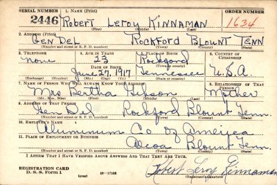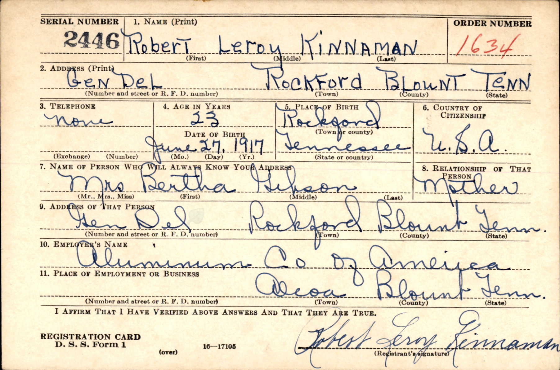 Robert Leroy “Roy” Kinnaman was born at Rockford, Tennessee, the son of Bertha E. Gibson.