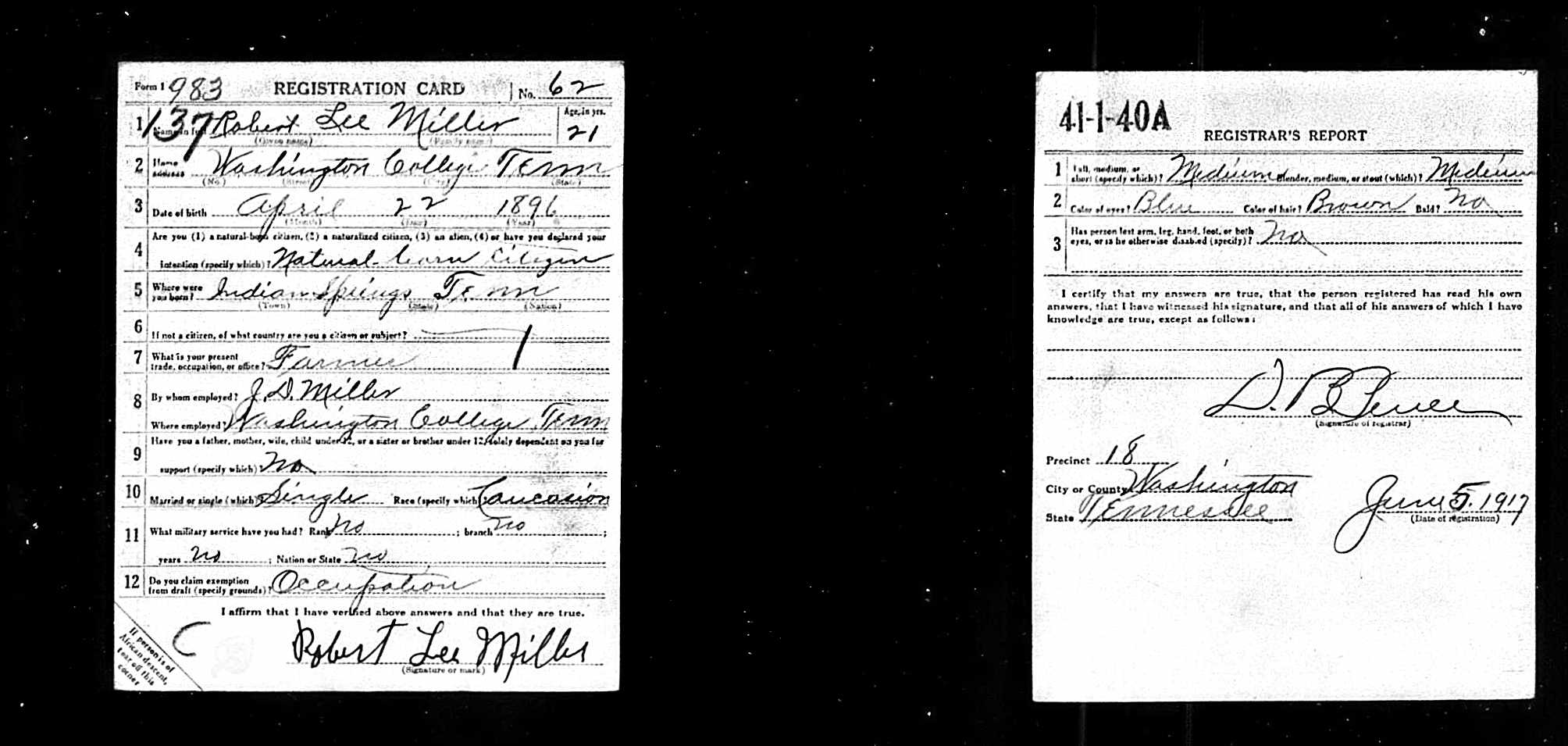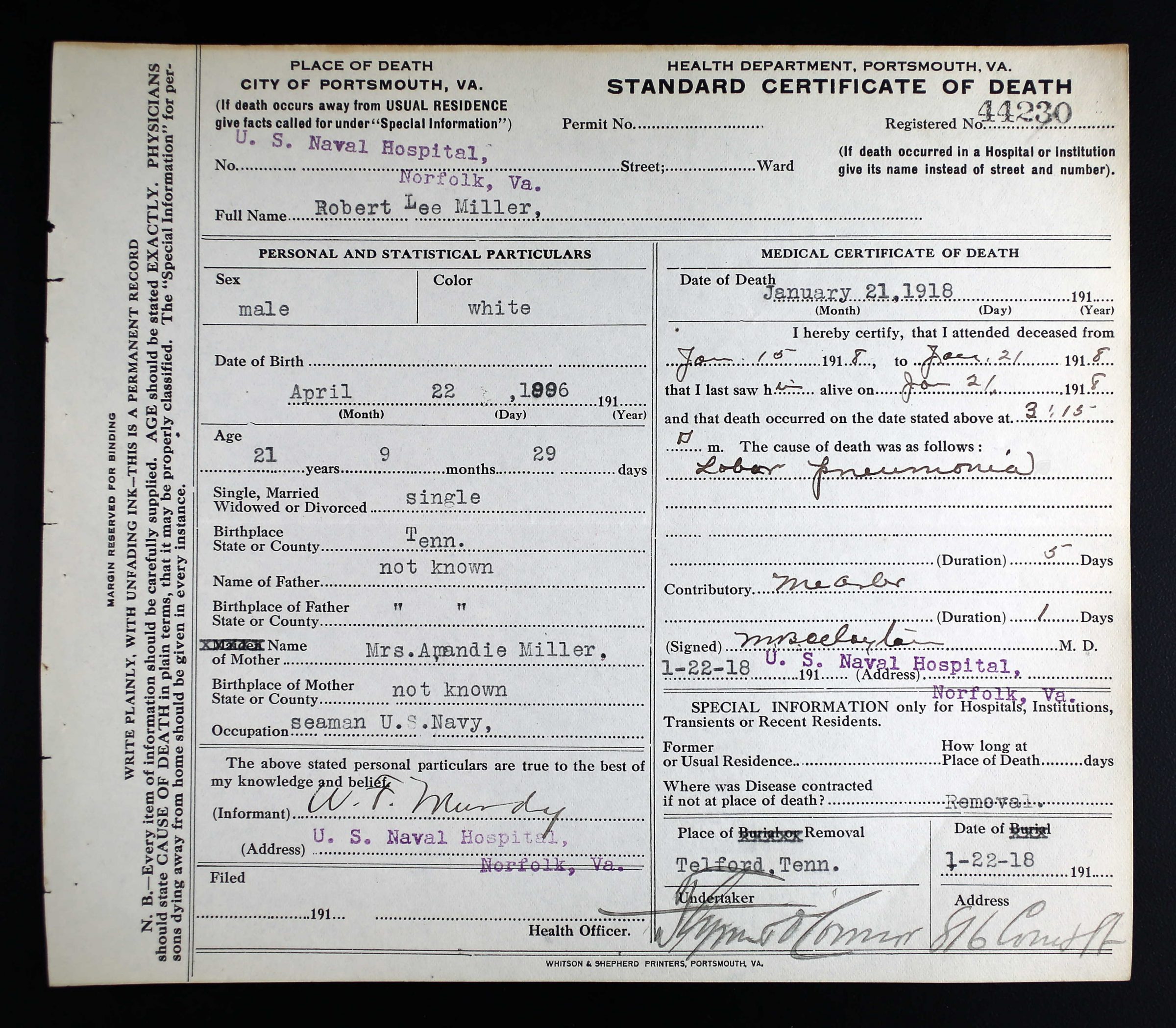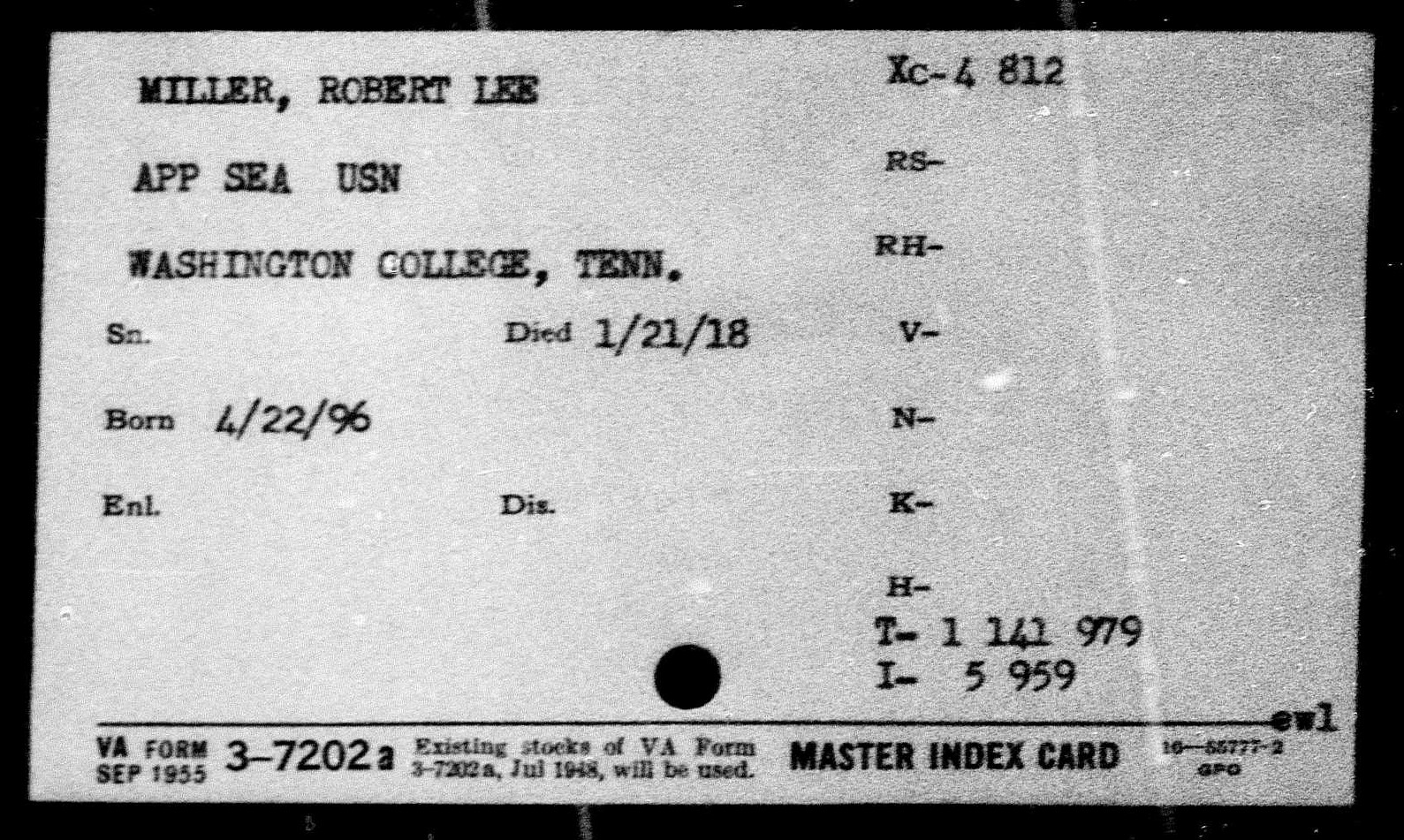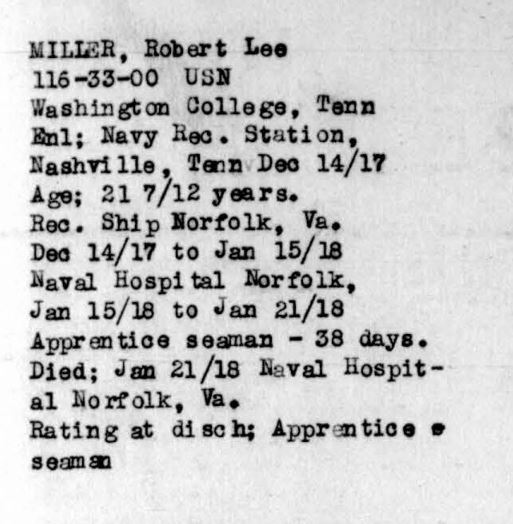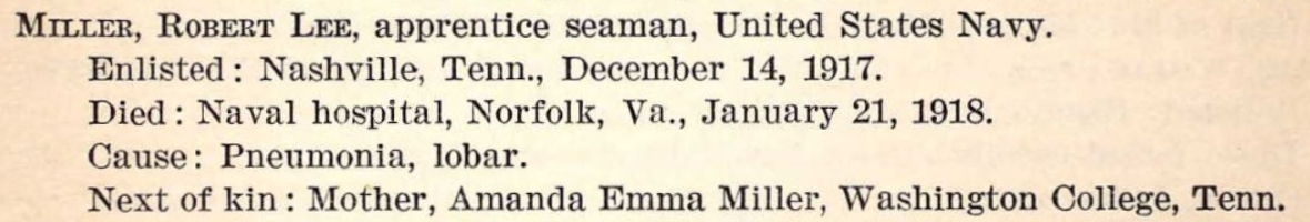 Robert Lee Miller resided at Washington College, TN, son of Mrs. Amanda Emma Miller. He enlisted at the Navy Recruit Station in Nashville on 14 December 1917.