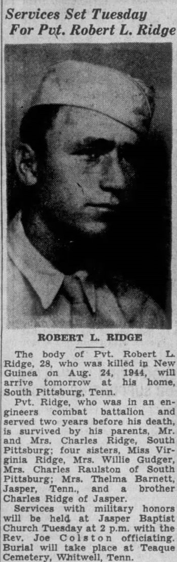 The body of Pvt. Robert L. Ridge, 28, who was killed in New Guinea on August 24, 1944, will arrive tomorrow at his home, South Pittsburg, Tenn. Pvt. Ridge, who was in an engineers combat battalion and served two years before his death, is survived by his parents, Mr. and Mrs. Charles Ridge, South Pittsburg,; four sisters, Miss Virginia Ridge, Mrs. Willie Gudger, Mrs. Charles Raulston of South Pittsburg; Mrs. Thelma Barnett, Jasper, Tenn., and a brother Charles Ridge of Jasper. Services with military honors will be held at Jasper Baptist Church. Burial will take place at Teaque Cemetery, Whitwell, Tenn.