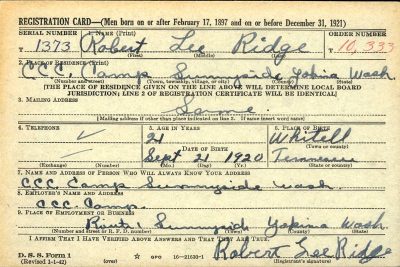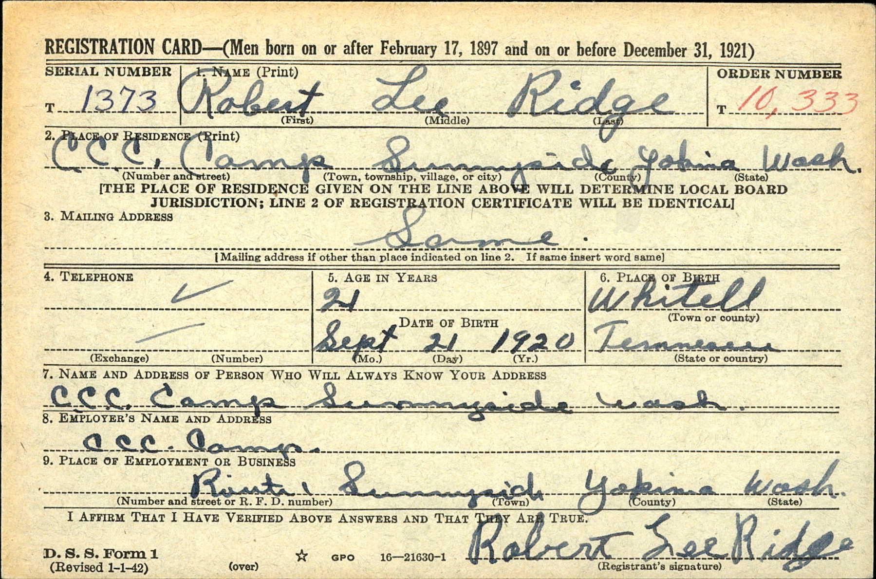 Pvt Ridge resided at Pierce County in Washington State at the time of his enlistment on 15 August 1942. He is buried at Teague Cemetery, Powells Crossroads, Marion County, Tennessee.