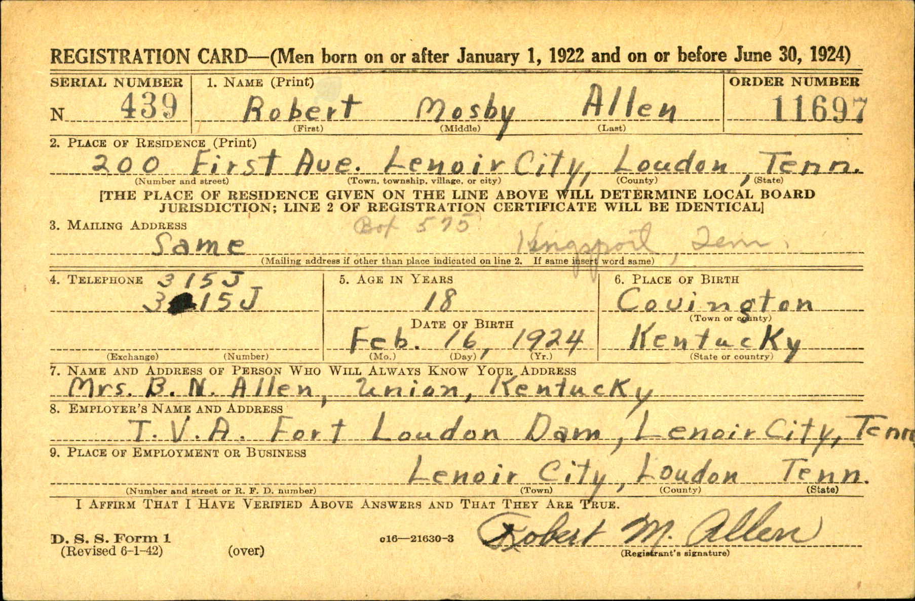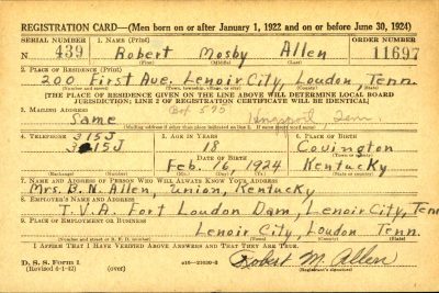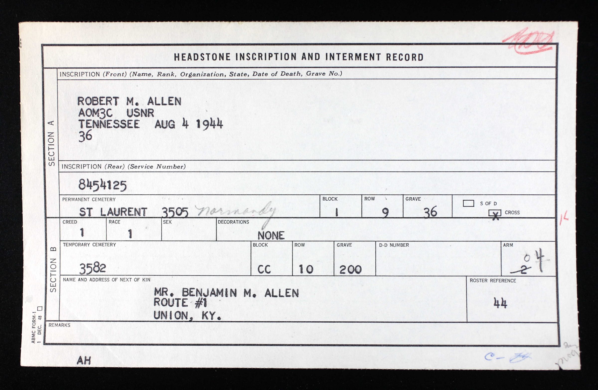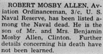 Robert Mosby Allen, Aviation Ordinanceman, 3/c, U.S. Naval Reserve, has been listed among the Naval dead. He is the son of Mr. and Mrs. Benjamin Mosby Allen, Clinton. Further details concerning his death have not been learned.