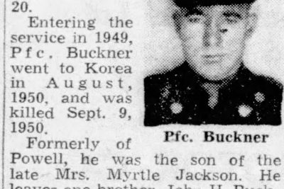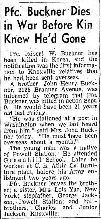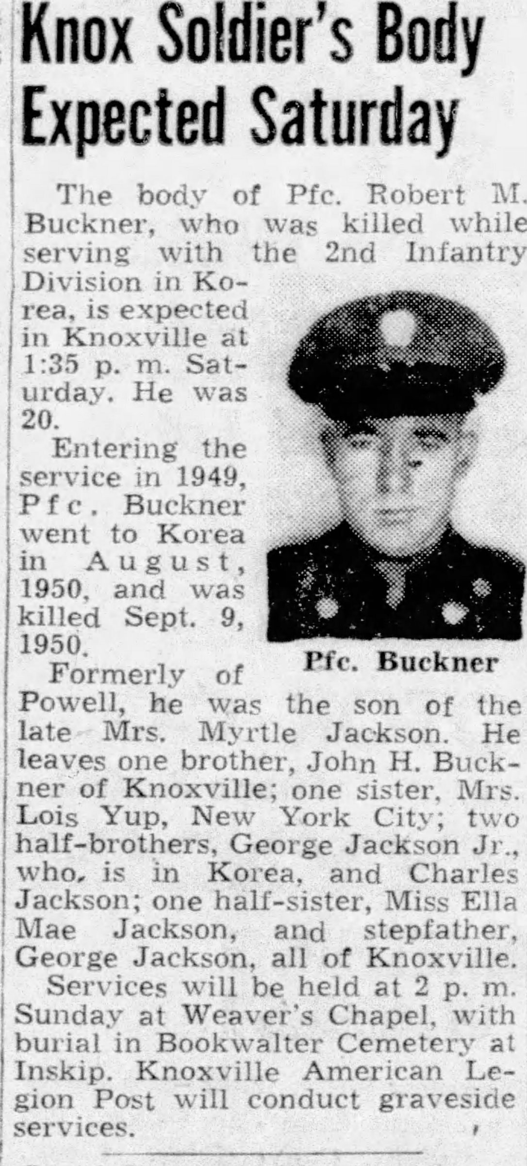 Pfc. Robert M. Buckner entered the service in 1949 and went to Korea in August, 1950. Formerly of Powell, he was the son of the late Mrs. Myrtle Jackson. He leaves one brother, John H. Buckner of Knoxville; one sister, Mrrrs. Lois Yup, New York City; two half-brothers, George Jackson Jr., who is in Korea and Charles Jackson; one half-sister, Miss Ella Mae Jackson, and stepfather George Jackson, all of Knoxville.