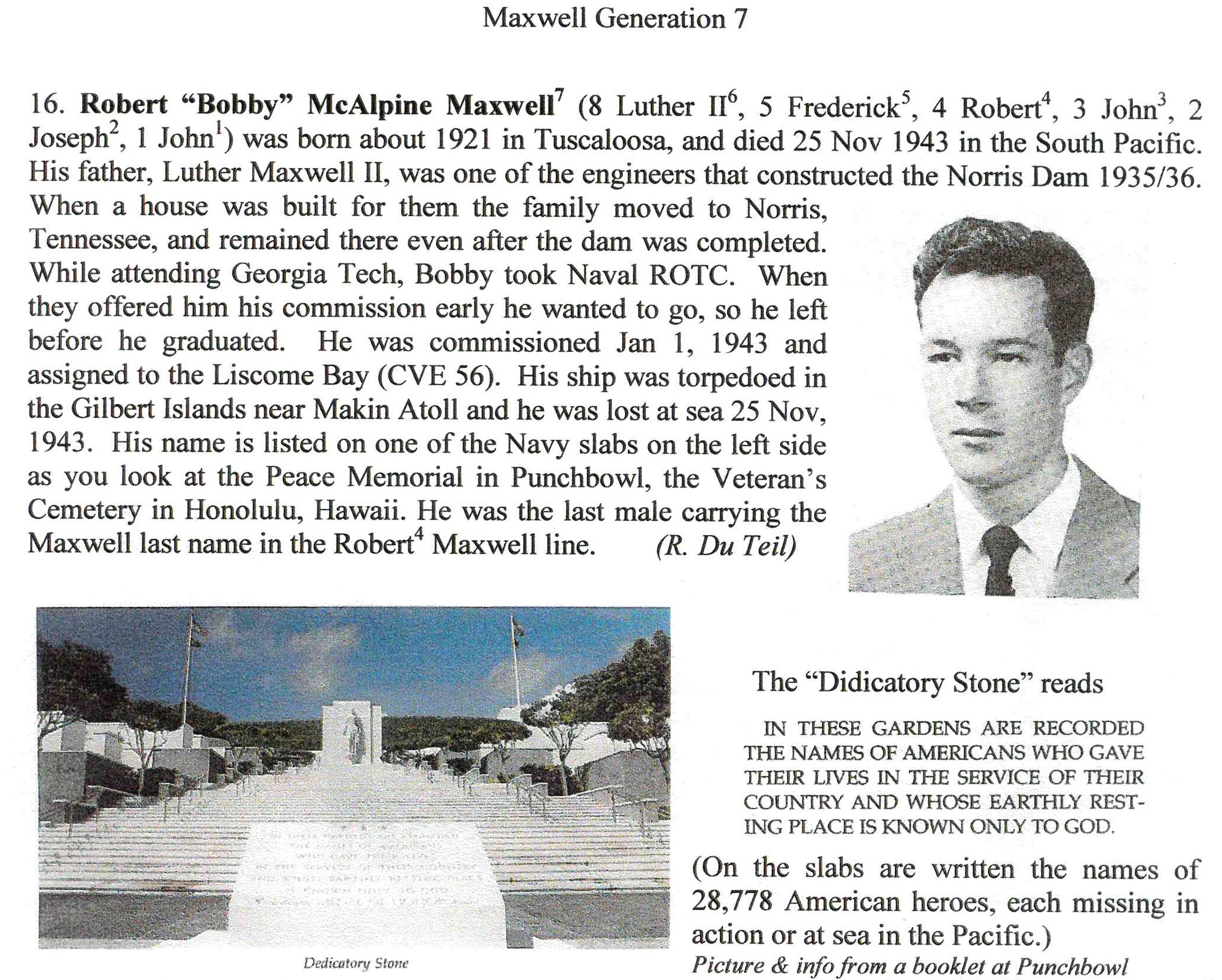 Robert (Bobby) McAlpine Maxwell was born at Tuscaloosa, Alabama, the son of Luther Henderson Maxwell and Virginia McAlpine.
