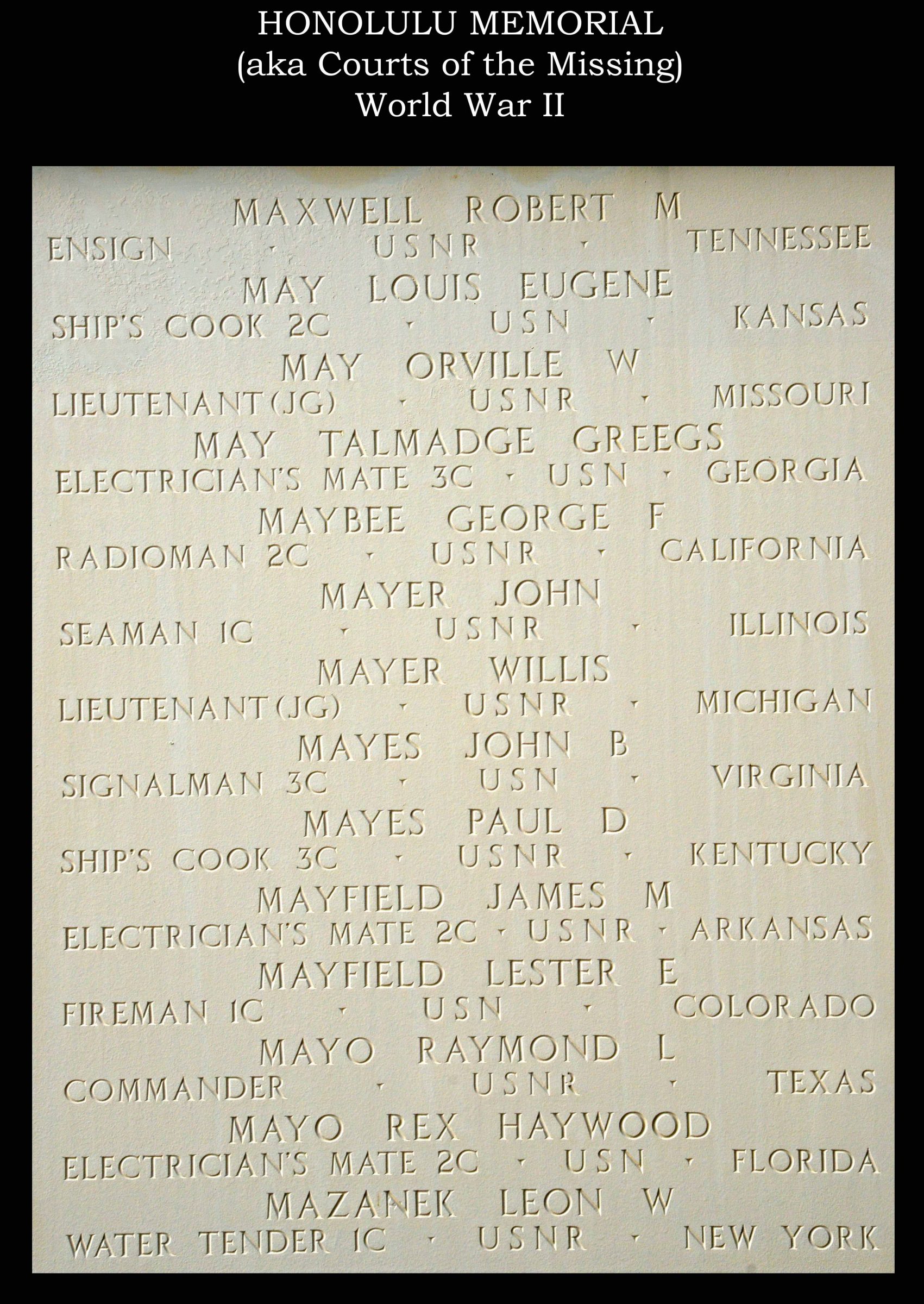 Memorialized at the Honolulu Memorial, Honolulu, HI