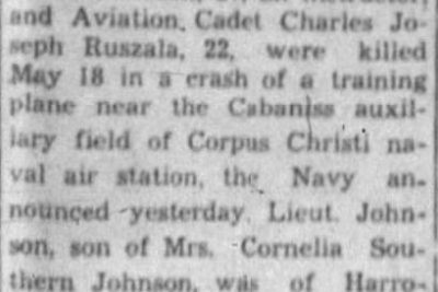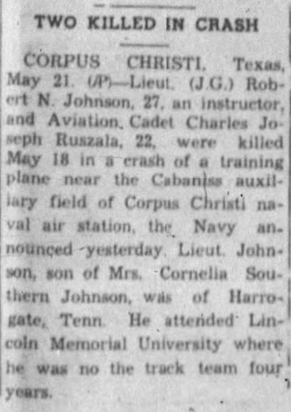Lieut, (J.G.) Robert N. Johnson, 27, an instructor, and aviation Cadet Charles Joseph Ruszala, 22, were killed May 18 in a crash of a training plane near the Cabaniss auxillary field of Corpus Christi naval air station, the Navy announced yesterday. Lieut. Johnson, son of Mrs. Cornelia Southern Johnson, was of Harrogate, Tenn. He attended Lincoln Memorial University where he was on the track team four years.