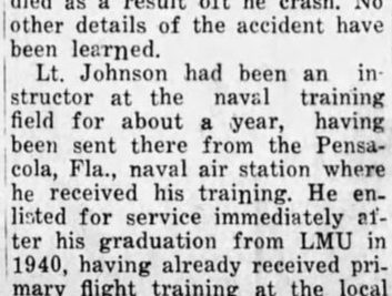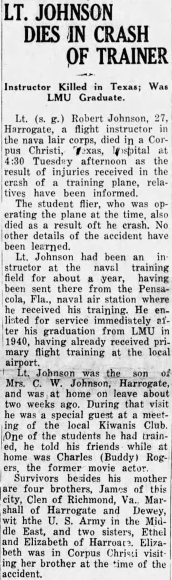 Lt. Johnson had been an instructor at the naval training field for about a year, having been sent there from the Pensacola, Fla., naval air station where he received his training. He enlisted for service immediately after his graduation from LMU in 1940, having already received primary flight training at the local airport. Lt. Johnson was the son of Mrs. C.W. Johnson, Harrogate, and was at home on leave about two weeks ago. During that visit he was special guest at a meeting at the local Kiwanis Club. One of the students he had trained, he told his friends while at home was Charles (Buddy) Rogers,, the former movie actor. Survivors besides his mother are four brothers, James of this city, Clen of Richmond, Va., Marshall of Harrogate and Dewey, with the U.S. Army in the Middle East, and two sisters, Ethel and Elizabeth of Harrogate. Elizabeth was in Corpus Christi visiting her brother at the time of the accident.