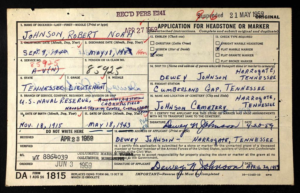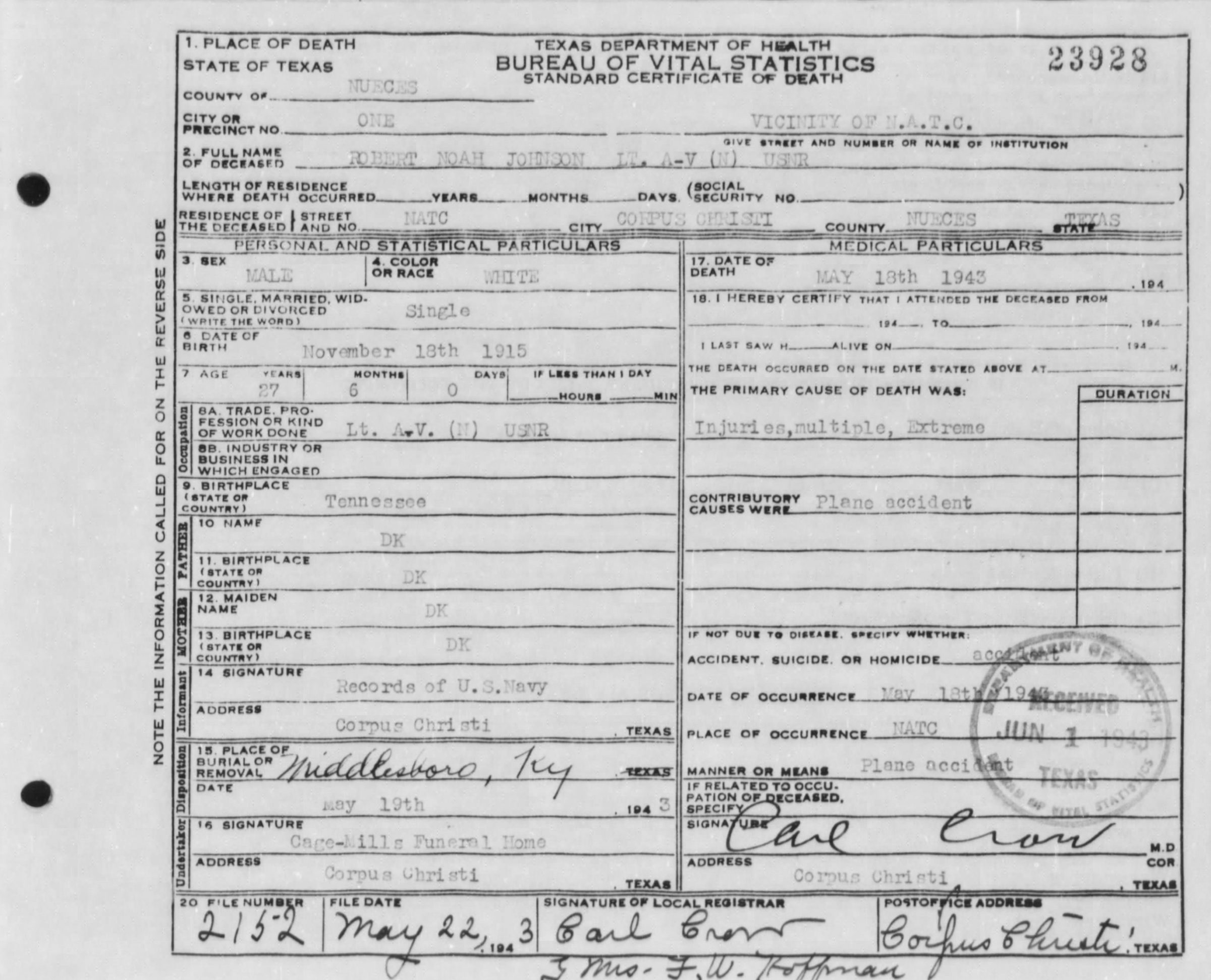 Lt Johnson died of injuries in Nueces, Texas due to a plane accident.